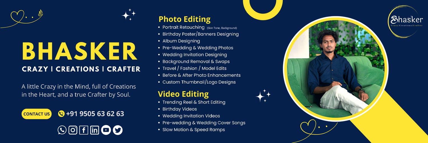 Paid Editor | Photo & Video Creator Delivering Full HD edits that bring moments to life. Birthday Posters | Reels | Wedding Videos | Album Design