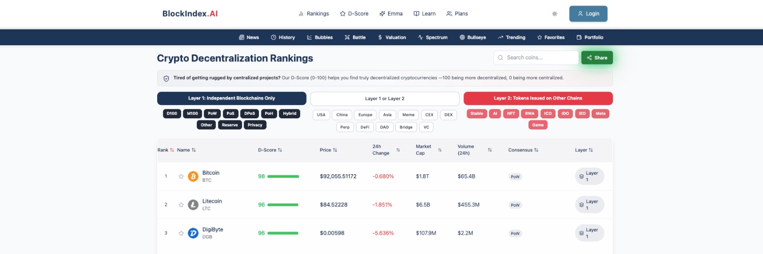 Crypto Rankings • Education • AI — All in 1 Platform. Discover truly decentralized blockchain projects with our patent-pending decentralization D-Score