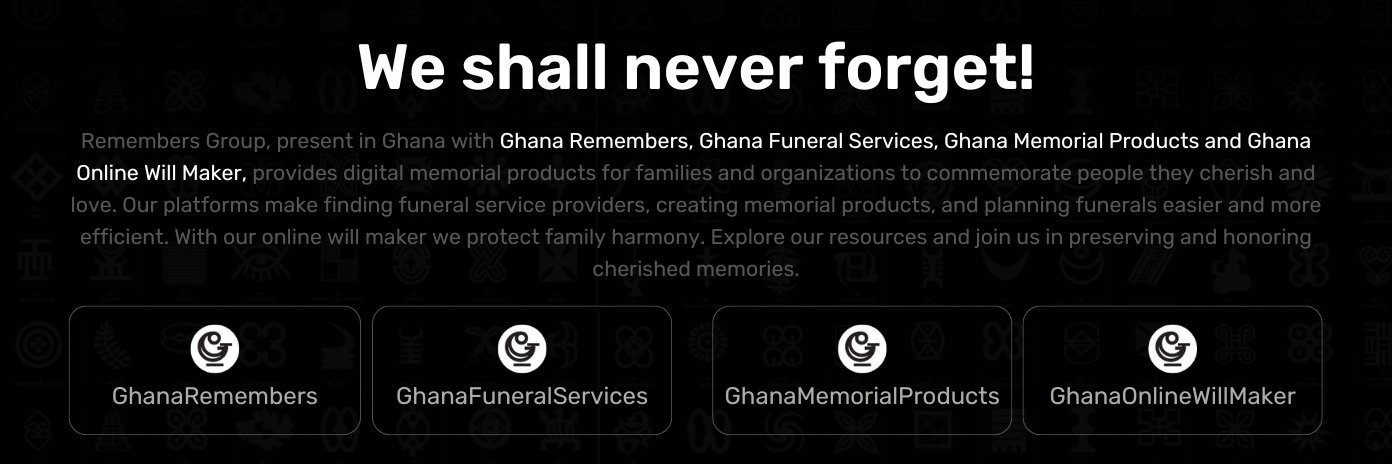 RemembersGroup in Ghana encompasses GhanaRemembers, GhanaFuneralServices and GhanaMemorialProducts which provides digital memorial products.