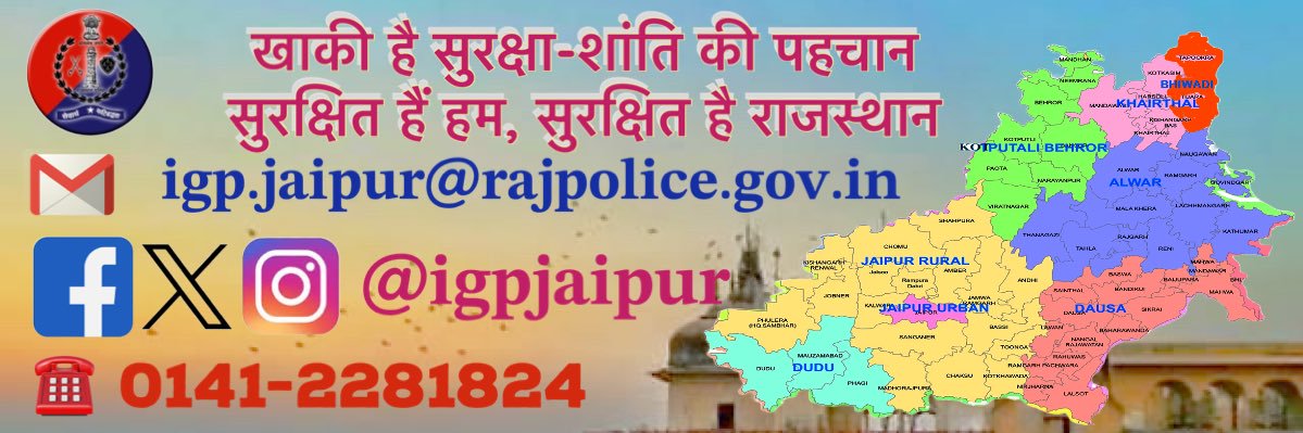 Official handle of Jaipur Range Police, #Rajasthan. Our motto ~ सेवार्थ कटिबद्धता (Committed to Serve). Do not report crime here. Emergency #Police Helpline 100
