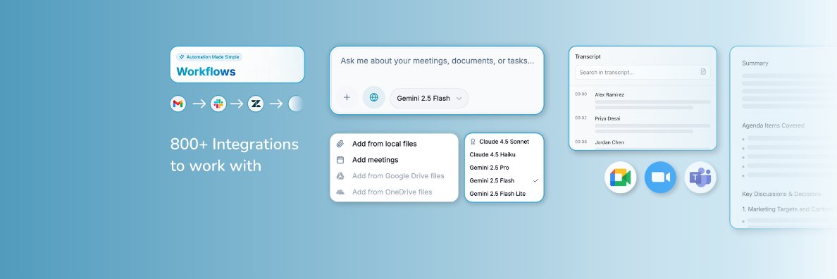 Turn your meetings and chats into automated actions. 🚀 🎙️Real-time Meeting Intelligence ⚙️800+ App Integrations 🧠Secure, Multi-Model AI Workspace.