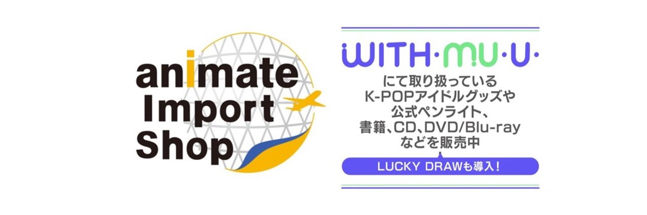 K-POPアイドルの公式ライセンスグッズや CD・Blu-rayなどを販売中!大阪の梅田にanimate Import Shop 大阪もございます!Xアカウント:@animateISO #WITHMUU ※発信専用のため、こちらのアカウントからの返信は控えさせていただきます