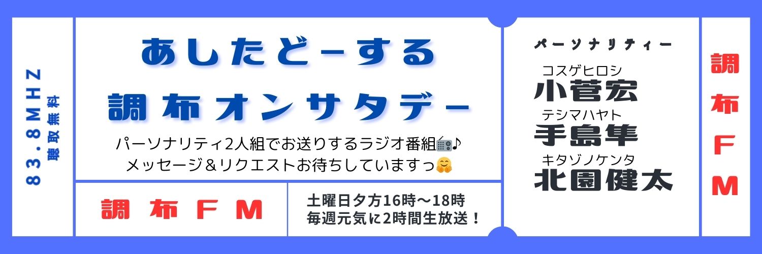 @ashisata838東京都調布市のコミュニティFM【調布FM】 毎週土曜日夕方4時から2時間生放送! 友達の家にいるようなゆる~い番組🎤 調布周辺の方→ラジオ周波数:83.8MHz スマホ&PCの方→ListenRadio(リスラジ)で関東→調布FMを選択 ハッシュタグ #あしたどーする メッセージは @ashisata838 でも🆗