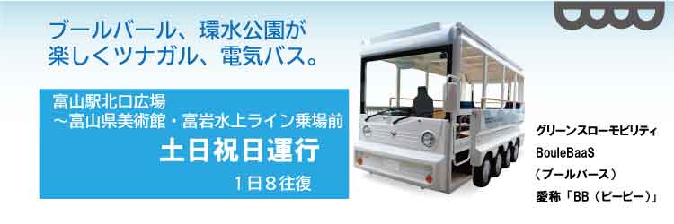 2020年10月から土日祝日運行!富山駅北エリア~富岩運河環水公園を走るグリーンスローモビリティ「BouleBaaS(ブールバース)」の運行情報やエリア情報をお届けします。