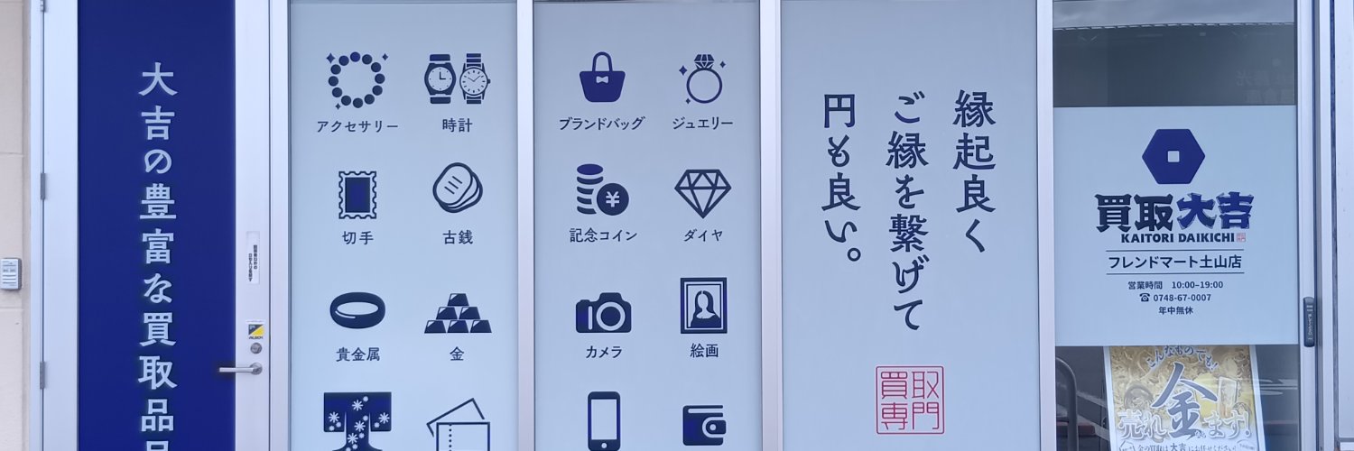 2025年4月15日よりオープンしました! 国道1号線沿い、フレンドマート土山店内角地にある青い暖簾が目印👀 業界最多の買取品目で多くのお品物の高価買取を実現しております‼️ お買い物のついでやお出かけの際は、ぜひ買取大吉フレンドマート土山店へお立ち寄りください