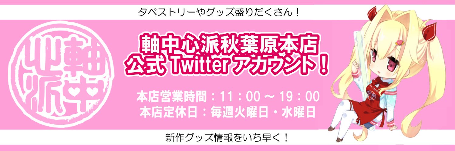こみっく軸中心派秋葉原本店のスタッフ達が、グッズの最新情報やキャンペーン告知などを行います。【※X上での個別の質問にはお答えしかねます。ご了承下さい】★営業時間:11:00-19:00(※木曜日は13:00オープン) 定休日:火・水(TEL:03-5209-7871)