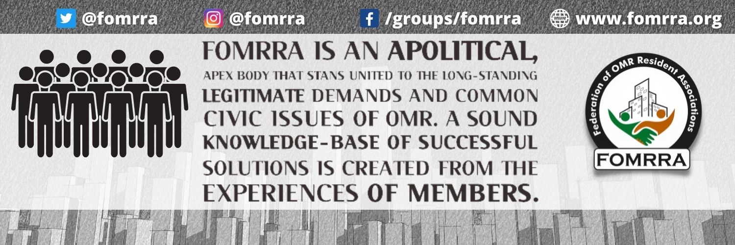 The Federation of OMR Residents Associations is an apolitical apex body to fight for long standing legitimate demands & stand united against official apathy.