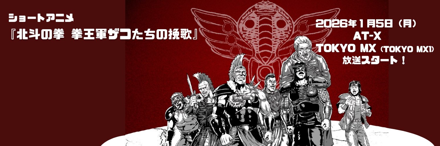 ショートアニメ「北斗の拳 拳王軍ザコたちの挽歌」公式アカウント。 個性豊かなザコたちが繰り広げる、もう一つの世紀末伝説!! 2026年1月5日(月)より放送開始! AT-X毎週月曜20時00分~ TOKYO MX毎週月曜21時54分~(TOKYO MX1) #ざこばん #zakoban #北斗の拳