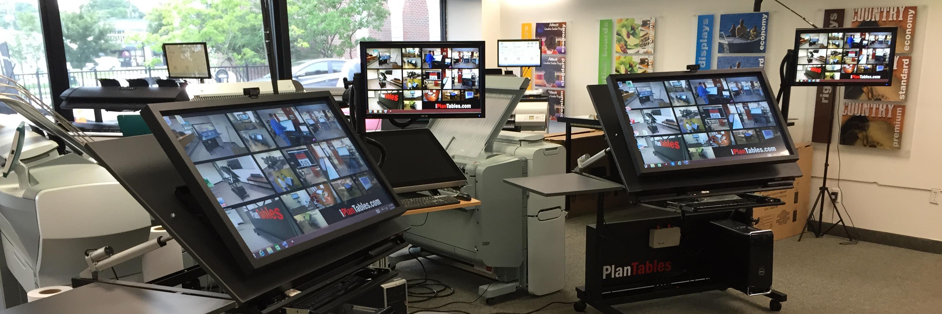 Full-size digital plan review and estimating tables with touchscreen, stylus, and mouse input. Built to streamline construction and drawing workflows.