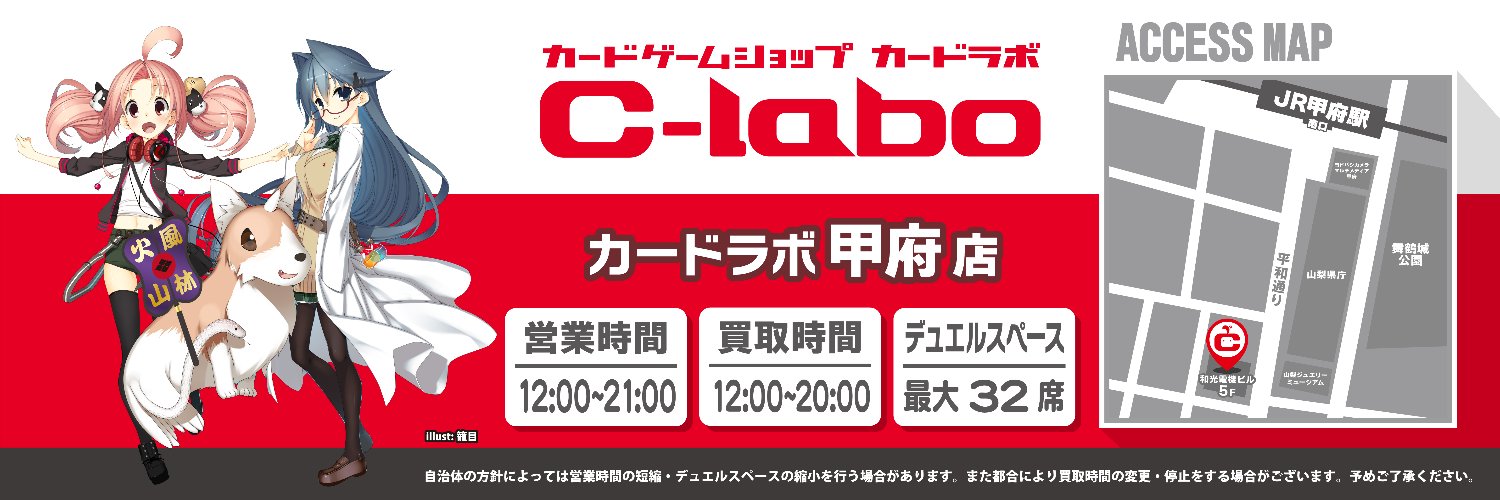 甲府駅南口平和通り沿いにある カードゲームショップ カードラボ甲府店公式アカウントです! 商品入荷情報、買取情報、イベント情報を発信していきます!! フォローをよろしくお願いします♪ ご利用可能な決済方法や取り扱いタイトルはこちらをご確認ください↓ https://www.c-labo.jp/shop/koufu/