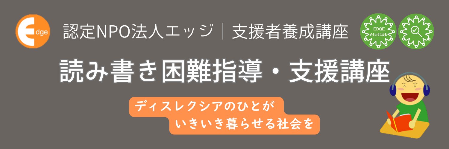 認定NPO法人エッジ 「読み書き困難指導・支援講座」公式アカウント ディスレクシアや学習障害など、読み書きに困難をみせるこどもの理解と指導・支援方法を学ぶeラーニング講座 Xでは、講座・セミナー・イベント情報、支援のヒント、受講生の声などを中心に配信 団体受講👉
