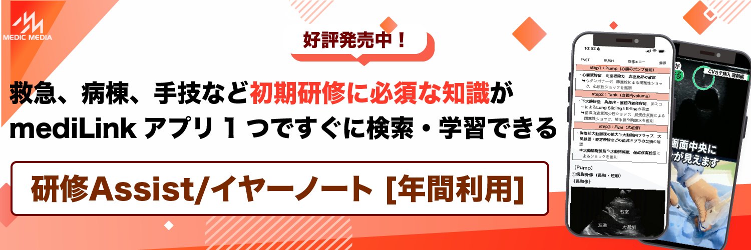 研修医に必須な知識が検索・学習できる使い放題プラン「研修Assist/イヤーノート 2026」を発売中!研修Assist,イヤーノート全巻,Quick Reference 救急外来編が使い放題です. ▼詳細はこちら👇