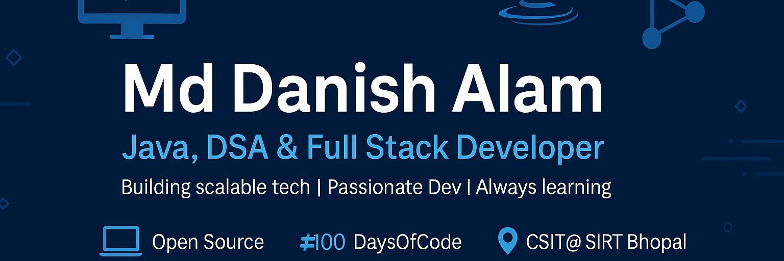 Hi, I'm Md Danish Alam, a passionate software developer with a strong foundation in Java, Data Structures & Algorithms, and Full Stack Development.