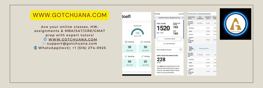 Expert tutors ready for assignments, online classes & top-tier GRE/GMAT/SAT/MBA prep. 📧 support@gotchuana.com 📲 WhatsApp(text): +1 (516) 274-0925
