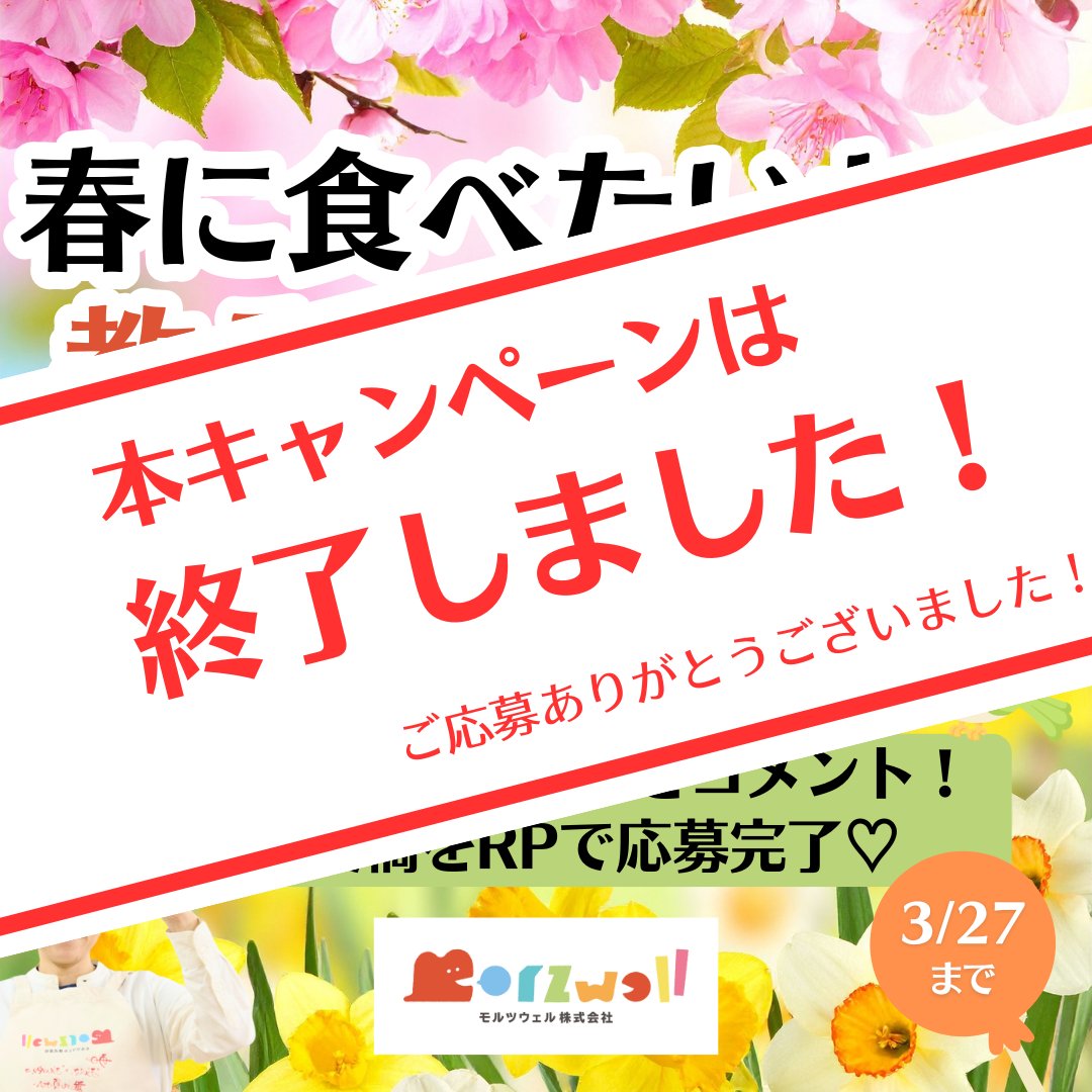モルツウェル @morzwell_food · 20h 本キャンペーンは終了しました❣️ x.com/morzwell_food/… ご参加の皆様、ありがとうございました❣️ 当選者には後日DMでお知らせ✨ お楽しみに〜😆 広報のO #キャンペーン終了 #ありがとうございましたL モルツウェル @morzwell_food · Mar 20 🌸春に食べたいもの🌸 コメントで教えてください✨ 📢応募方法📢 1️⃣この投稿に「春に食べたいもの」をコメント 2️⃣この投稿をRP(リポスト) 🎁1,000円分Amazonギフト券 抽選で5名様にプレゼント🎁 ⚠️3/27(金) 23:00迄 当選者にはDMでお知らせ! 真空調理済み食材『楽盛』製造 モルツウェAxMGuuJ 1 280