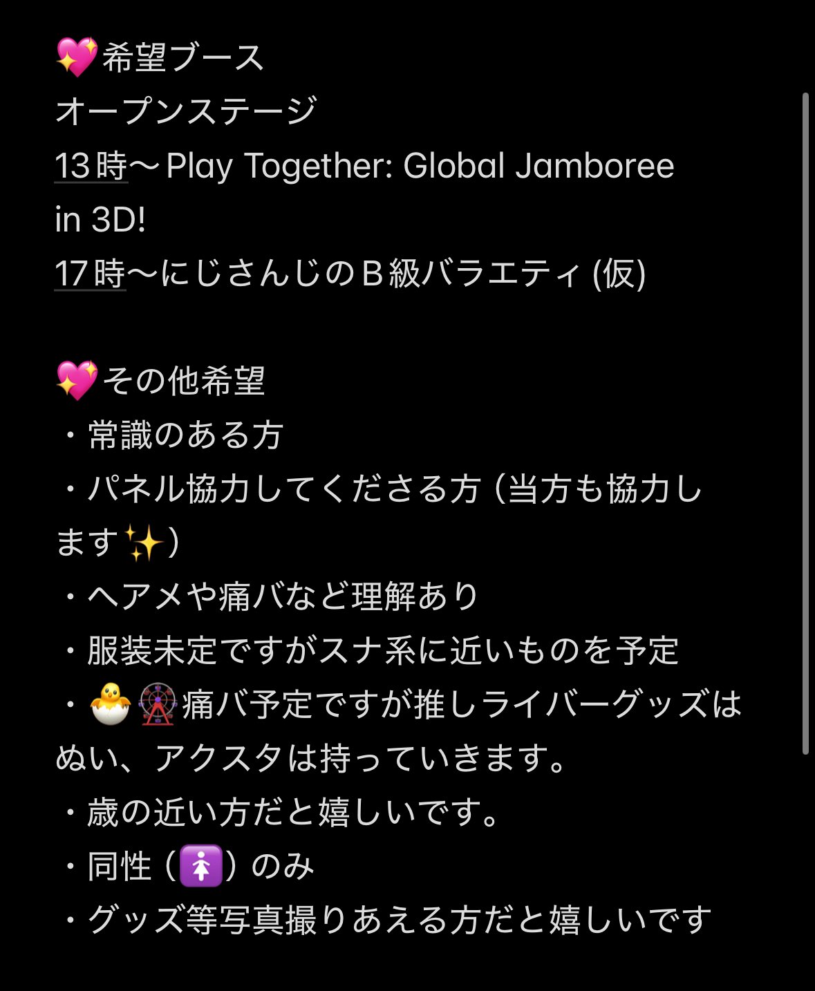 Tora @Toraneko0289 · 3h 【にじフェスDAY1 同行者募集】 同行してくださる方探してます! 詳しくは画像をご確認ください! 検索からでもお気軽にお声がけください🙇 #にじフェス同行者 #にじフェス同行者募集9 4 377
