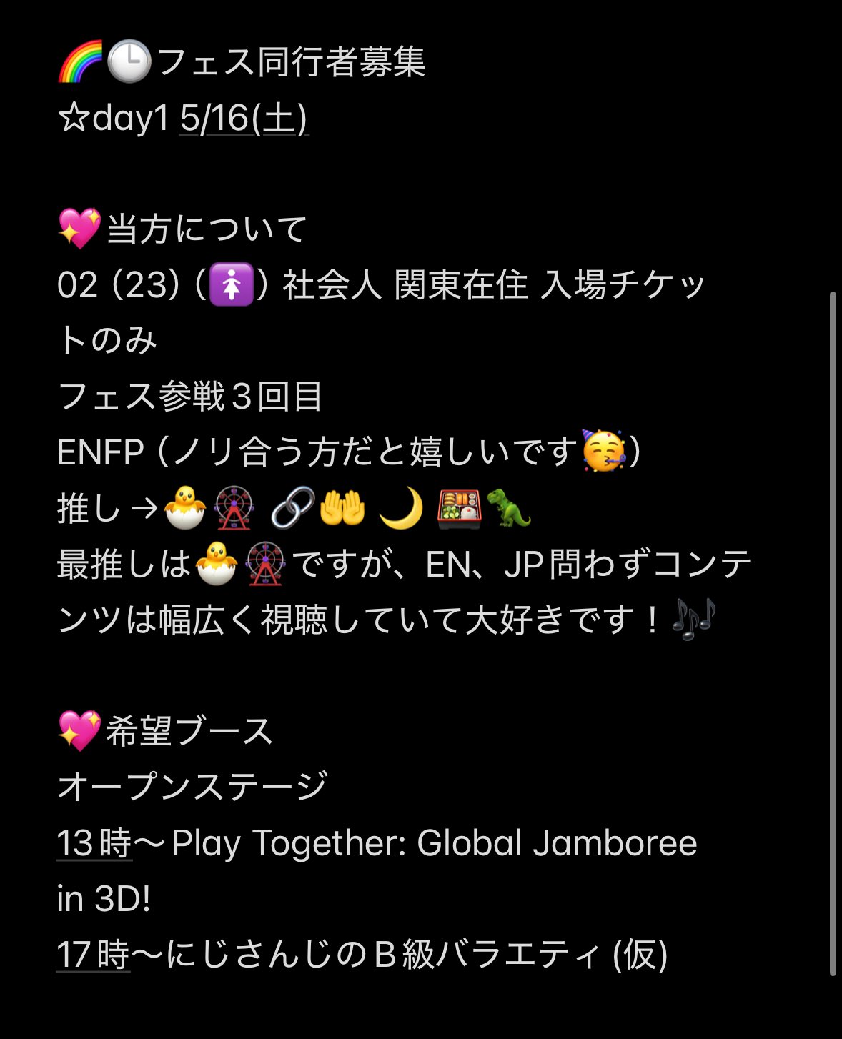 a @ri7na6 · 4h 【にじフェスDay1 同行者募集】 @0 5/16(土)当方入場券のみ 同行予定だった友達がチケット外れてしまったため同行者募集させて頂きます❣️ お気軽にお声掛けください🌟 #にじフェス同行者 #にじフェス同行者募集s 580