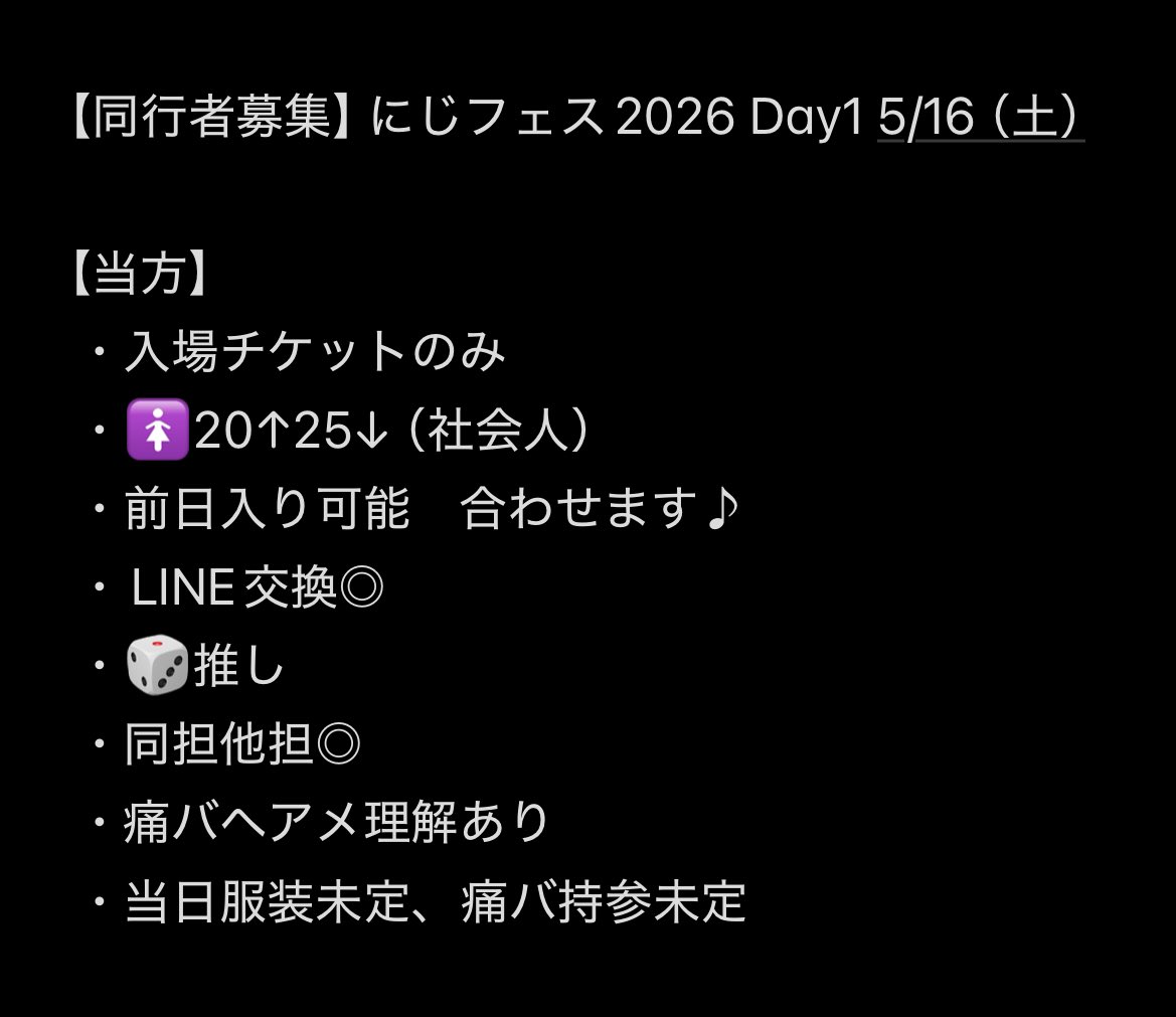 凪緒✦✧ @Nao_cos01 · 4h 【にじフェス2026 Day1 同行者様募集】 Day1(5/16) 入場券のみ にじフェス同行者様探してます。 ぼっちでしかも初参戦なので 一緒に楽しめる方! 条件に合う方がいらしたら お気軽にお声掛けください〜 #にじフェス同行者募集 #にじフェス同行者 512