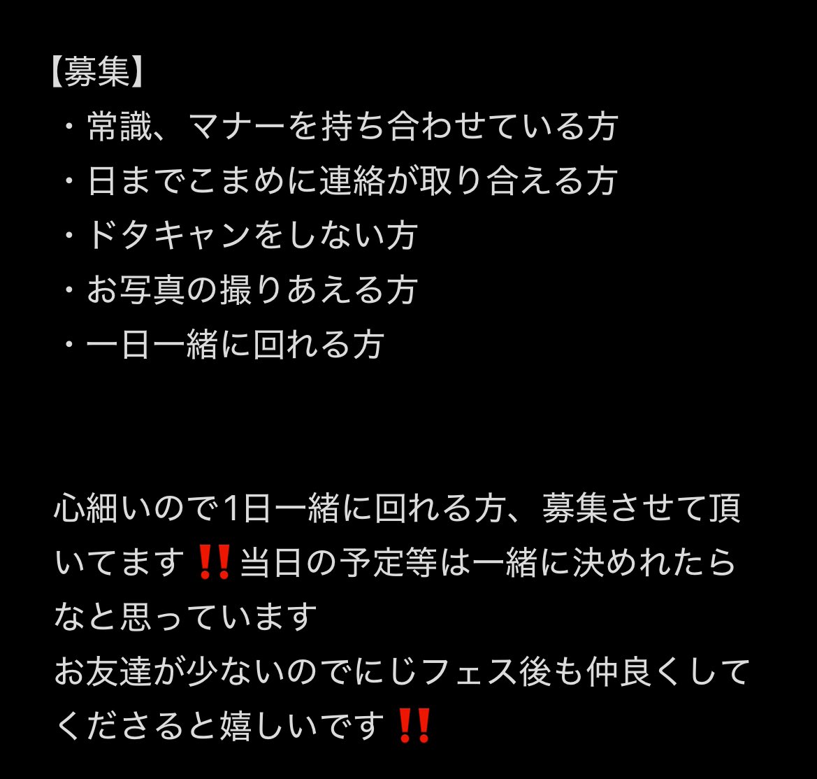 おあー^^ @oarrrr_rz · 52s 【同行者募集】 にじフェス2026 Day2 入場券のみ 同行者募集中です〜 気軽にお声掛けください!!! #にじフェス2026 #にじフェス同行者 #にじフェス同行者募集 4