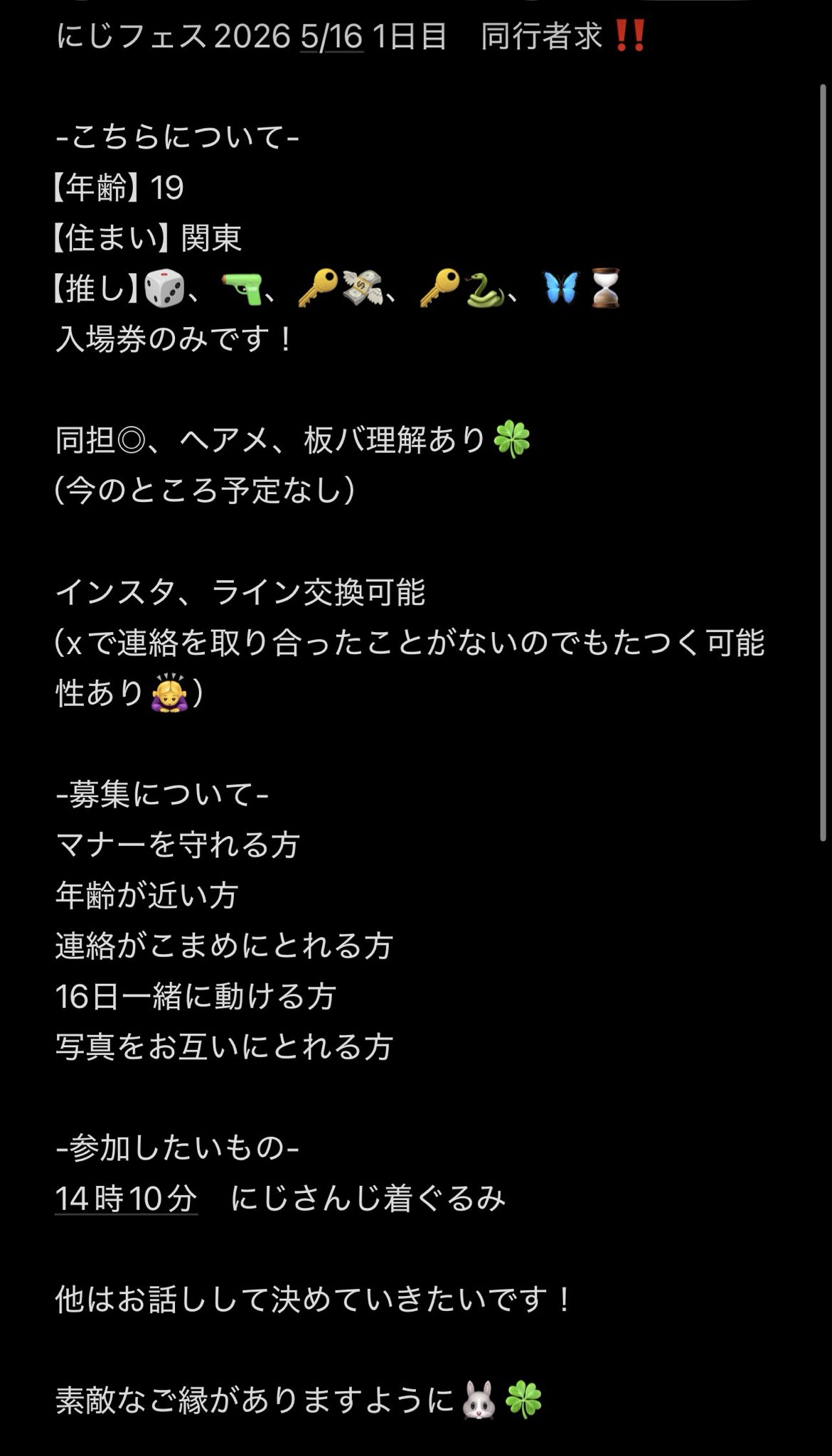 おにぎり【取引】 @osiga_toutoiiii · 5h 【にじフェス2026 Day1 同行者様募集】 🌟Day1(5/16) 入場券のみ にじフェス同行者様探してます❕ ぼっちなので一緒に楽しめる方! 条件に合う方がいらしたら是非!お気軽にお声掛けください〜! #にじフェス同行者募集 #にじフェス同行者r 2 3 948