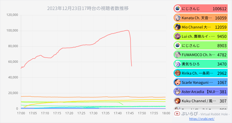 ぶいらび - Virtual Rabbit Hole - @v_rabbit_hole · Dec 23, 2023 🏆2023年12月23日17時台 【🥇100,612】にじさんじ #にじさんじ ガーデン&カフェステージ Day1公式放送【#にじフェス202… 【🥈16,059】Kanata Ch. 天音かなた #天界学園放送部 【DARK SOULS III】#15 DLCその2突入!闇… 【🥉12,059】Mio Channel 大神ミオ #ミオかわいい 【雑談】大神ミオxHLB 1 242