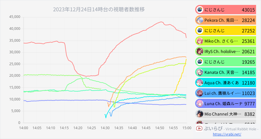 ぶいらび - Virtual Rabbit Hole - @v_rabbit_hole · Dec 24, 2023 🏆2023年12月24日14時台 【🥇43,015】にじさんじ #にじさんじ ガーデン&カフェステージ Day2公式放送【#にじフェス202… 【🥈28,224】Pekora Ch. 兎田ぺこら #ぺこらいぶ 【有馬記念】2023年有馬記念で大勝する!!!!!!!!!!!… 【🥉27,252】にじさんじ #にじさんじ 【ライブ本編】にvWVs 1 478
