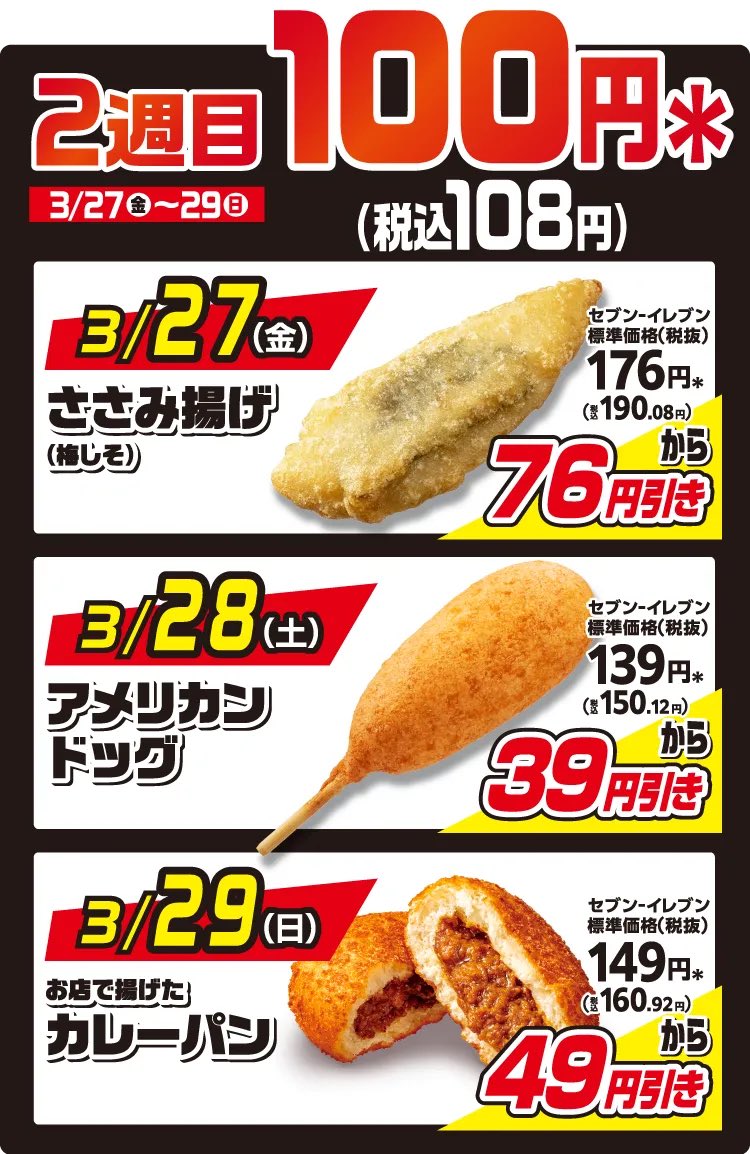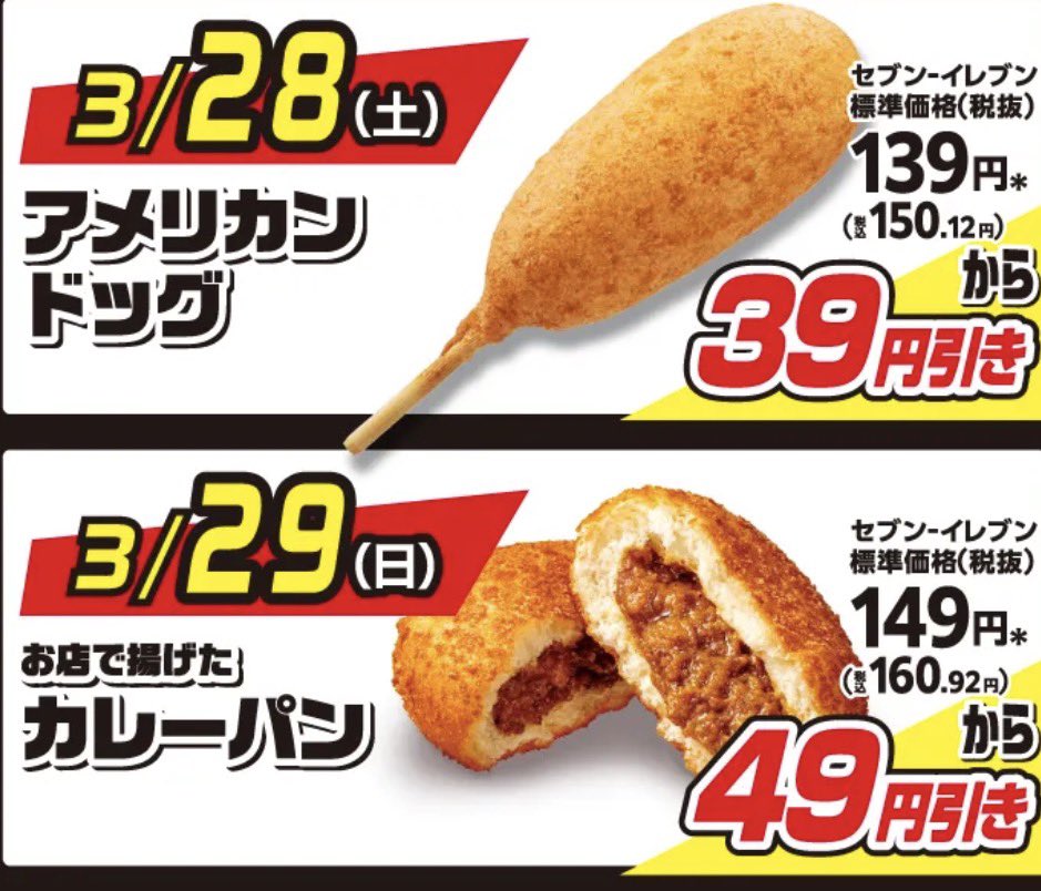エキセントリック @eccentric60 · 1h 今日はセブンイレブンの「アメリカンドッグ」が39円引き あまりお得感が無いね🤔 #セブンイレブン #アメリカンドッグ #セブンの揚げ物日替わりスーパーセールw セブン‐イレブン・ジャパン @711SEJ · 7h ◤◢◤◢◤◢◤◢◤◢◤◢◤◢ #セブンの揚げ物日替わりスーパーセール 開催中🎉🎉🎉 ◤◢◤◢◤◢◤◢◤◢◤◢◤◢ 本日3/28(土)限定で、 【税抜100円】になる対象商品は…! // アメリカンドッグ🌟 \\ おやつに食べたい~って人➡リポsej.co.jp/cmp/hs2603/?ut…72B7WG 91
