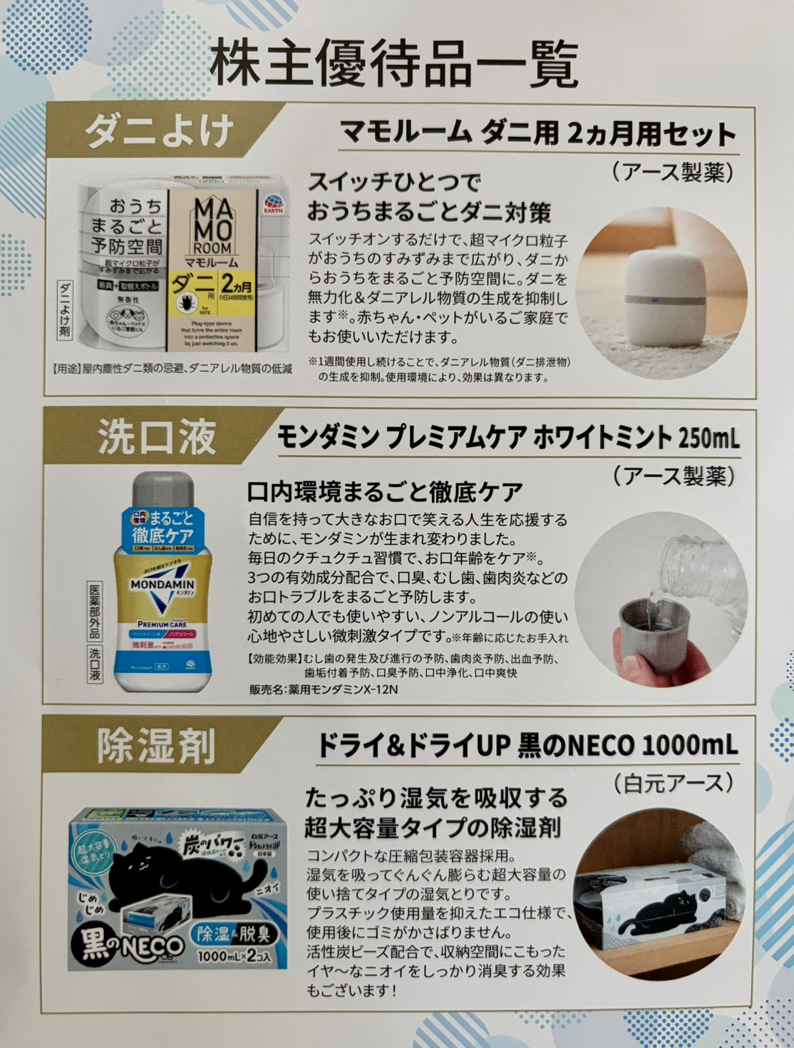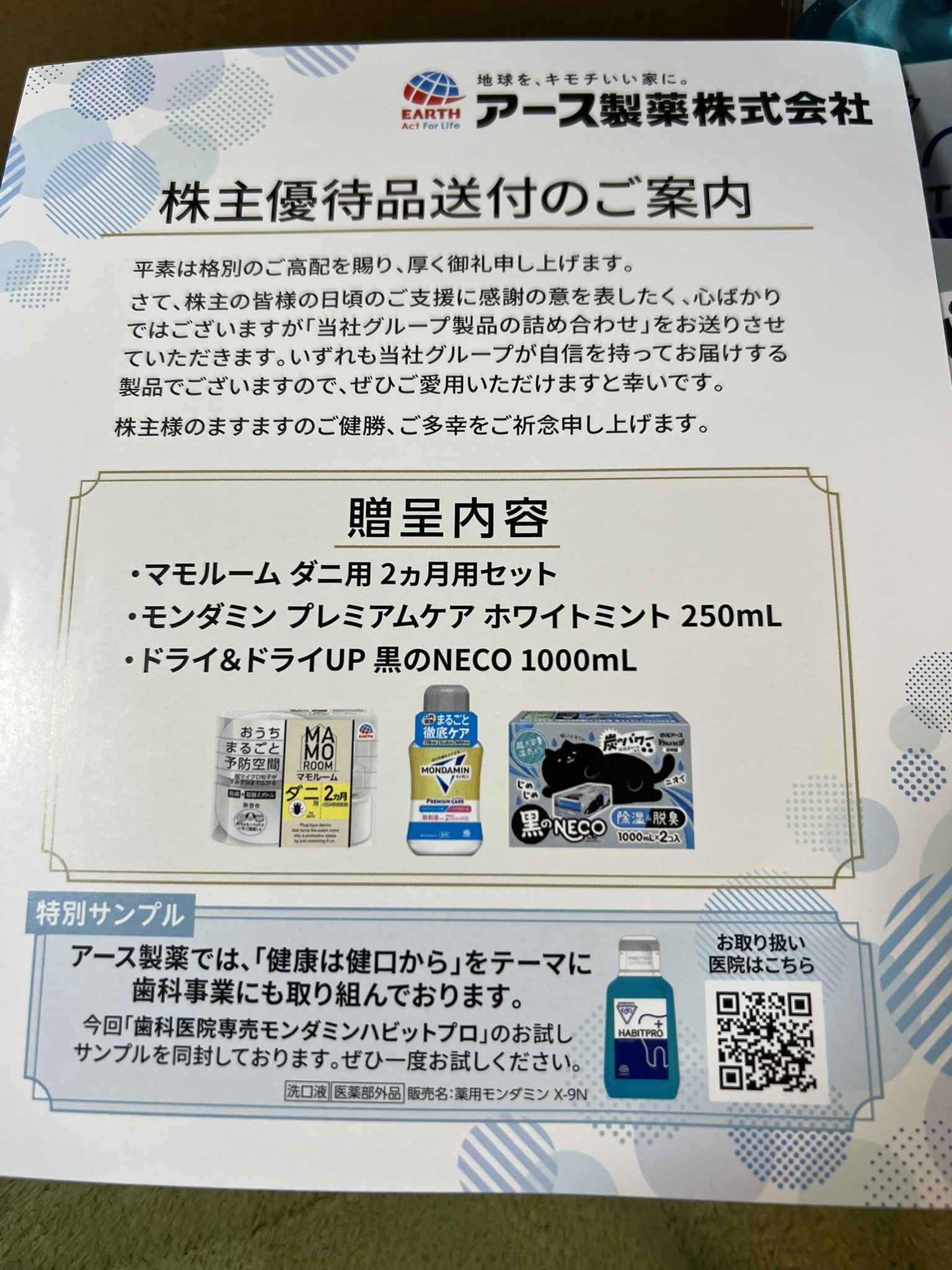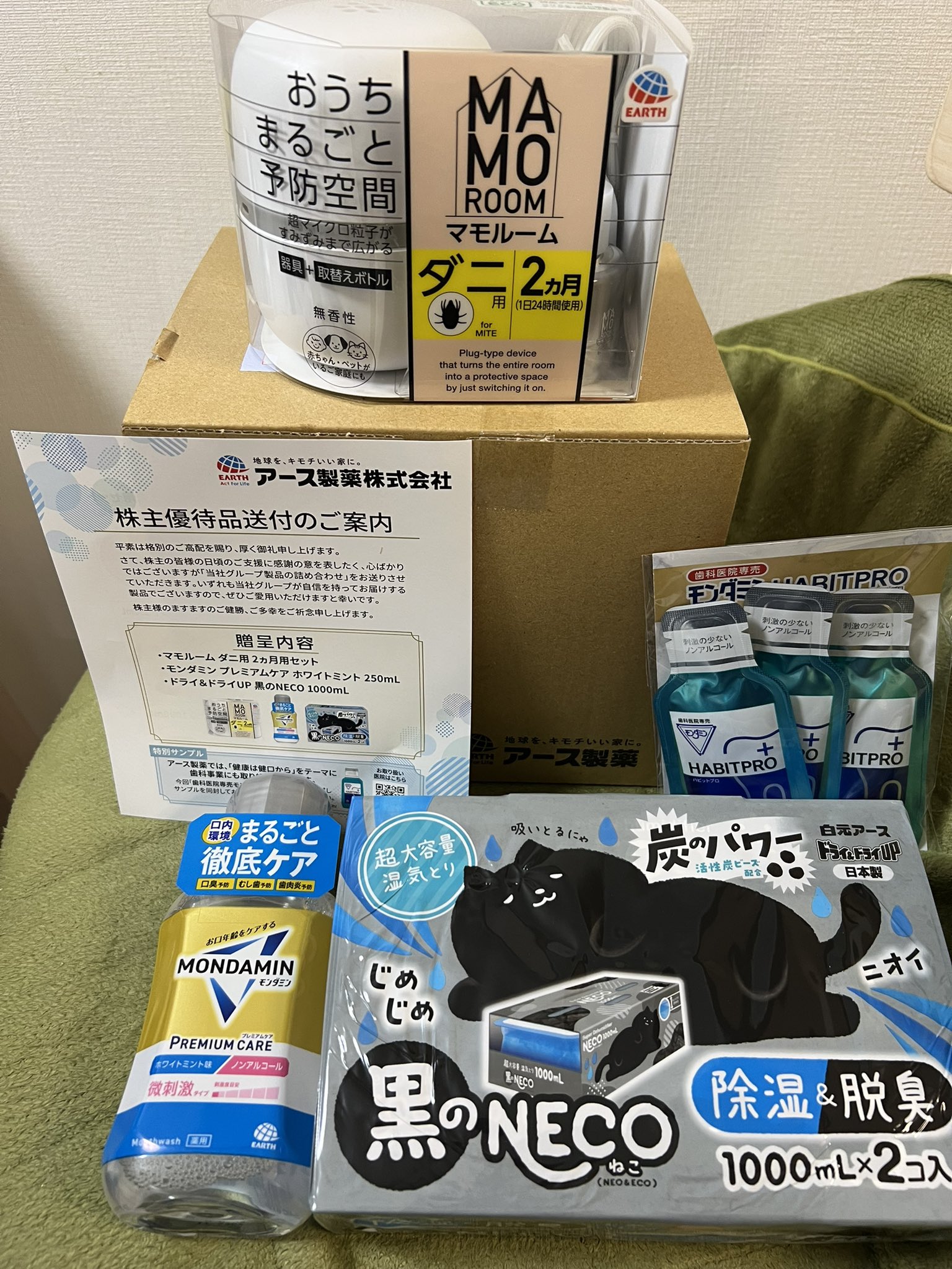 氷見寒ぶり太郎@株主優待(優待QUOカード・ギフトで生活したい🥹)@(富士・鎌倉太郎改名) @Uber45043067 · 2m アース製薬(4985)様 株主優待品届きました🥰 年二回防虫・マウスウオッシュ・入浴剤等が優待品として頂けるので嬉しいです。 いつもありがとうございます☺️ #アース製薬 #株主優待j 9