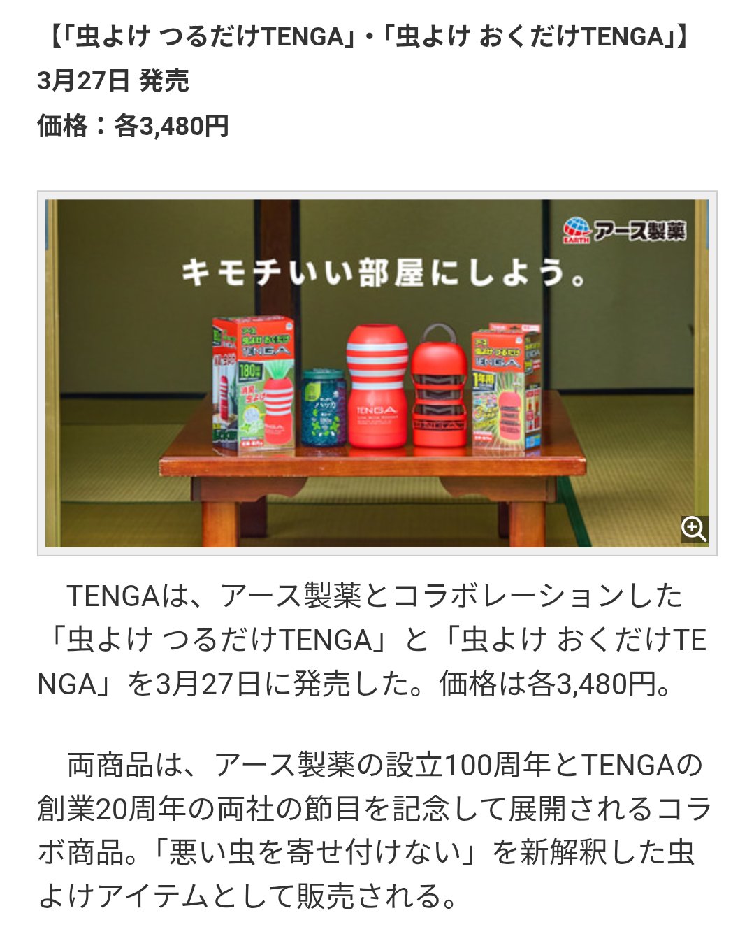 ヘムヘム… @KENTAN225 · 18h "#TENGA×#アース製薬 コラボTENGA型虫よけ発売! 物理的な虫だけでなく悪い虫(望まない訪問者)も遠ざける" l.smartnews.com/m-7q5IOkH6/6iX… TENGA×アース製薬コラボTENGA型虫よけ発売! 物理的な虫だけでなく悪い虫(望まない訪問者)も遠ざける (GAME Watch) 【「虫よけ つるだけTENGA」・「虫よけ おくだけTENGA」】 3月27日 発売 価格:各3,480円 TENGAは、アース製薬とコラボレーションした「虫よけ つるだけTENGA」と「虫よけ おくだけTENGA」を3月27日に発売した。価格は各3,480円。 両商品は、アース製薬の設立100周年とTENGAの... From smartnews.com 41