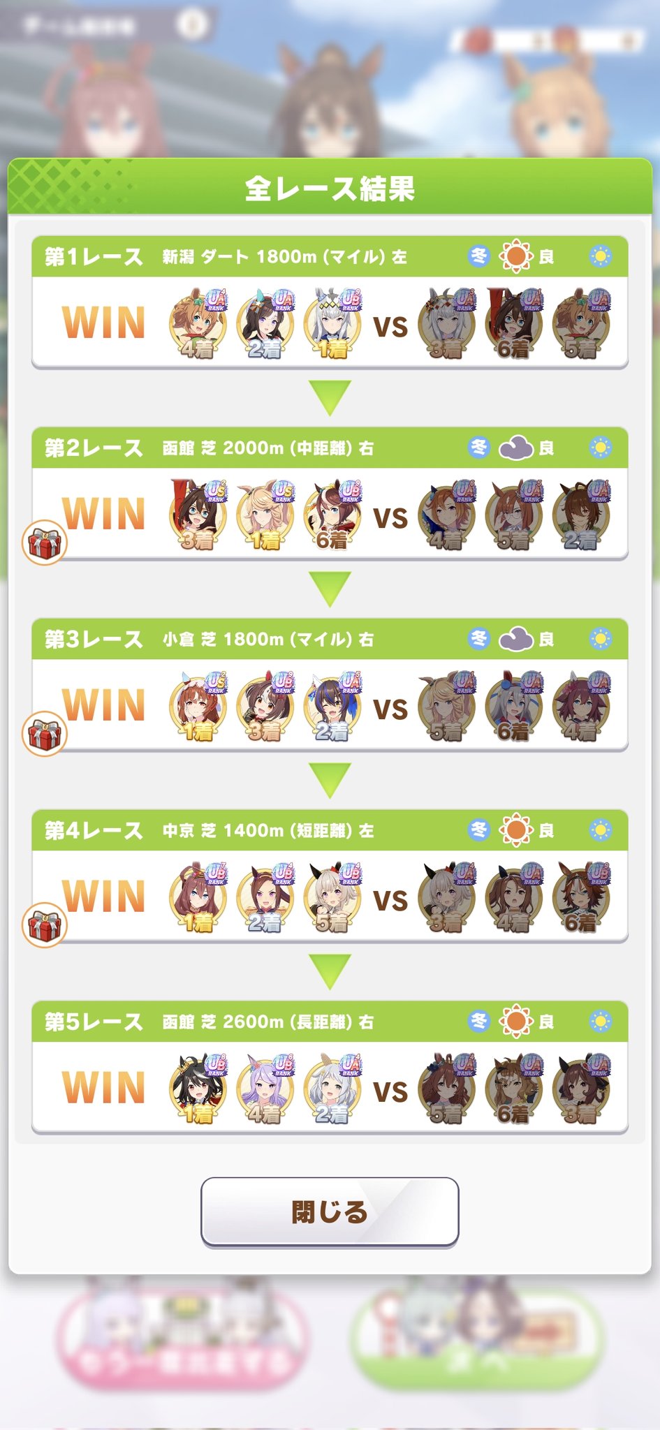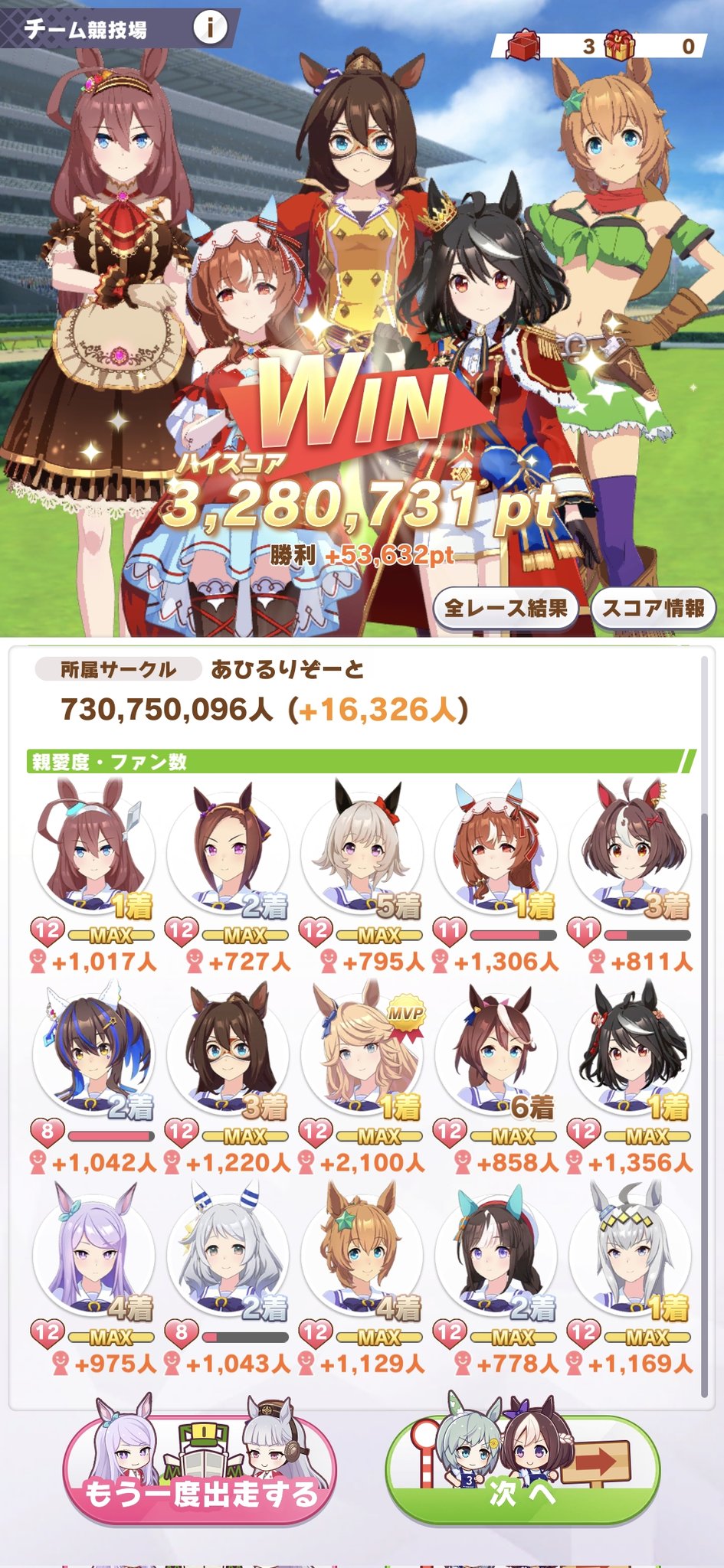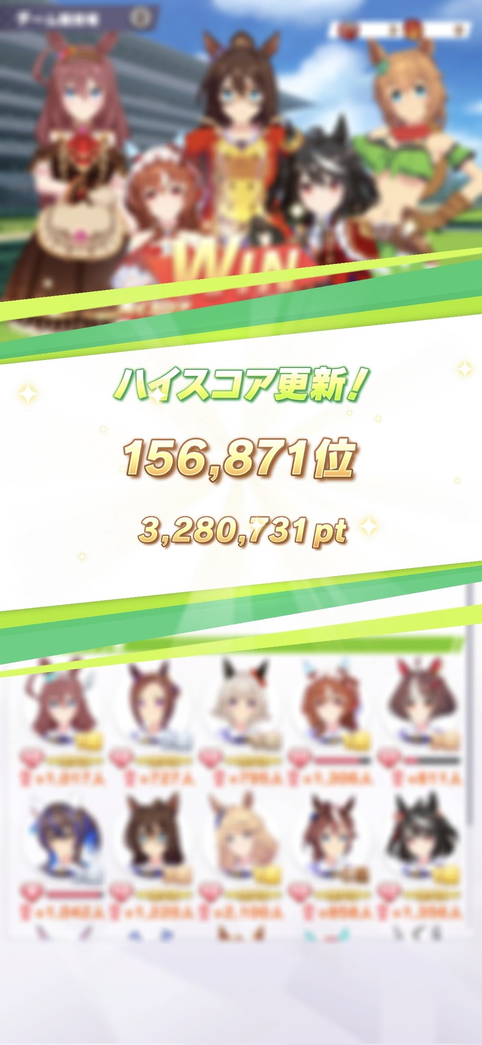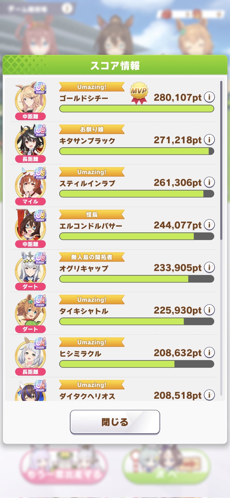 がとー @rx78gp02asai · 27m あ、チャンミーの決勝の結果ポストしてなかった(^_^;) ウマ娘チャンピオンズミーティング Bグループ決勝の結果 1位とれました(^_^) #ウマ娘プリティーダービー #チャンピオンズミーティング 2 11