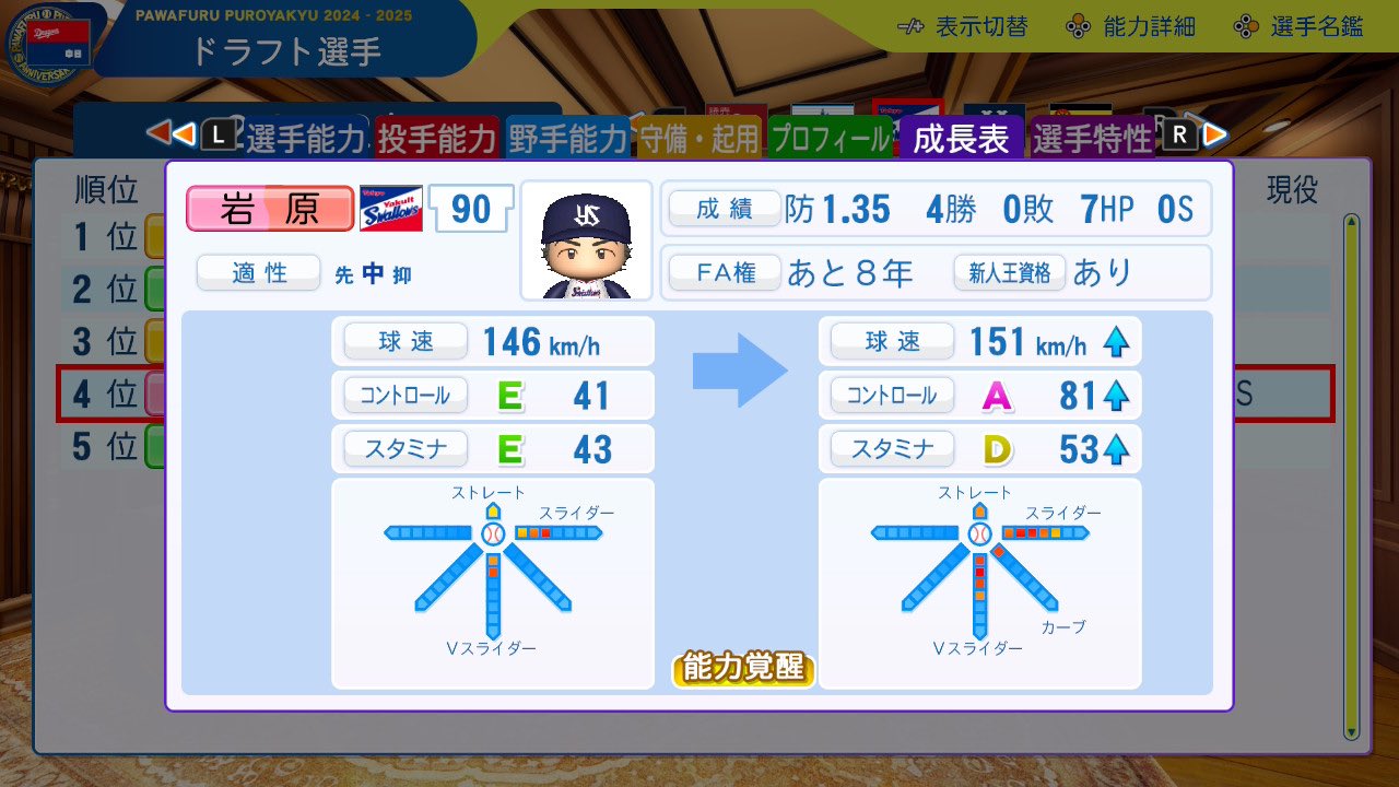 やりたいことをやろう @New681423886564 · 22h ドラ好き187 能力覚醒ってすごいね、別人かな 希望の星なので大事に使いたい #パワプロ #オーペナ #ペナント #ドラフト #野球 #swallows 1 18 2.4K