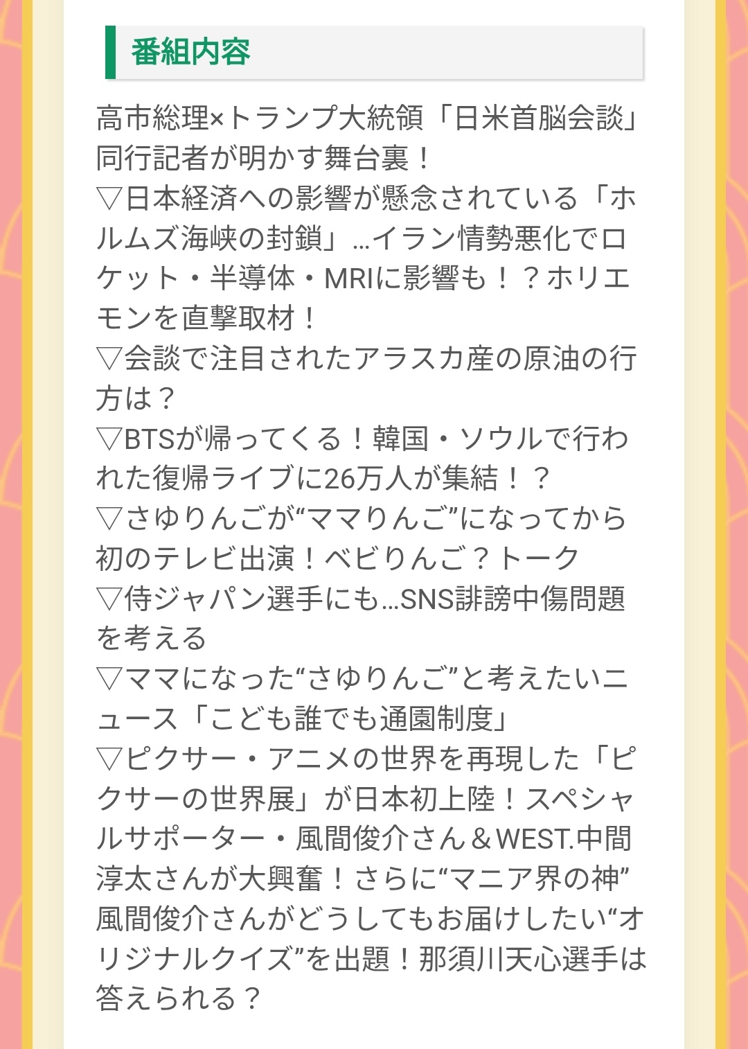 ジャニーズ出演情報 @13xIvlK6CP1hvqe · 5h Replying to @13xIvlK6CP1hvqe 3/29㈰テレビ③ 9:54- サンデー・ジャポン(TBS系)/#那須雄登 #ACEes #サンデージャポン #サンジャポ tbs.co.jp/sunjapo/ サンデー・ジャポン|TBSテレビ TBSテレビ毎週日曜あさ9時54分から放送の「サンデージャポン」公式ページです。MC爆笑問題が一週間を独自の目線でお届け!世の中の新たな一面が見えてくるジャーナリズム・バラエティ! From tbs.co.jp 1 1 69