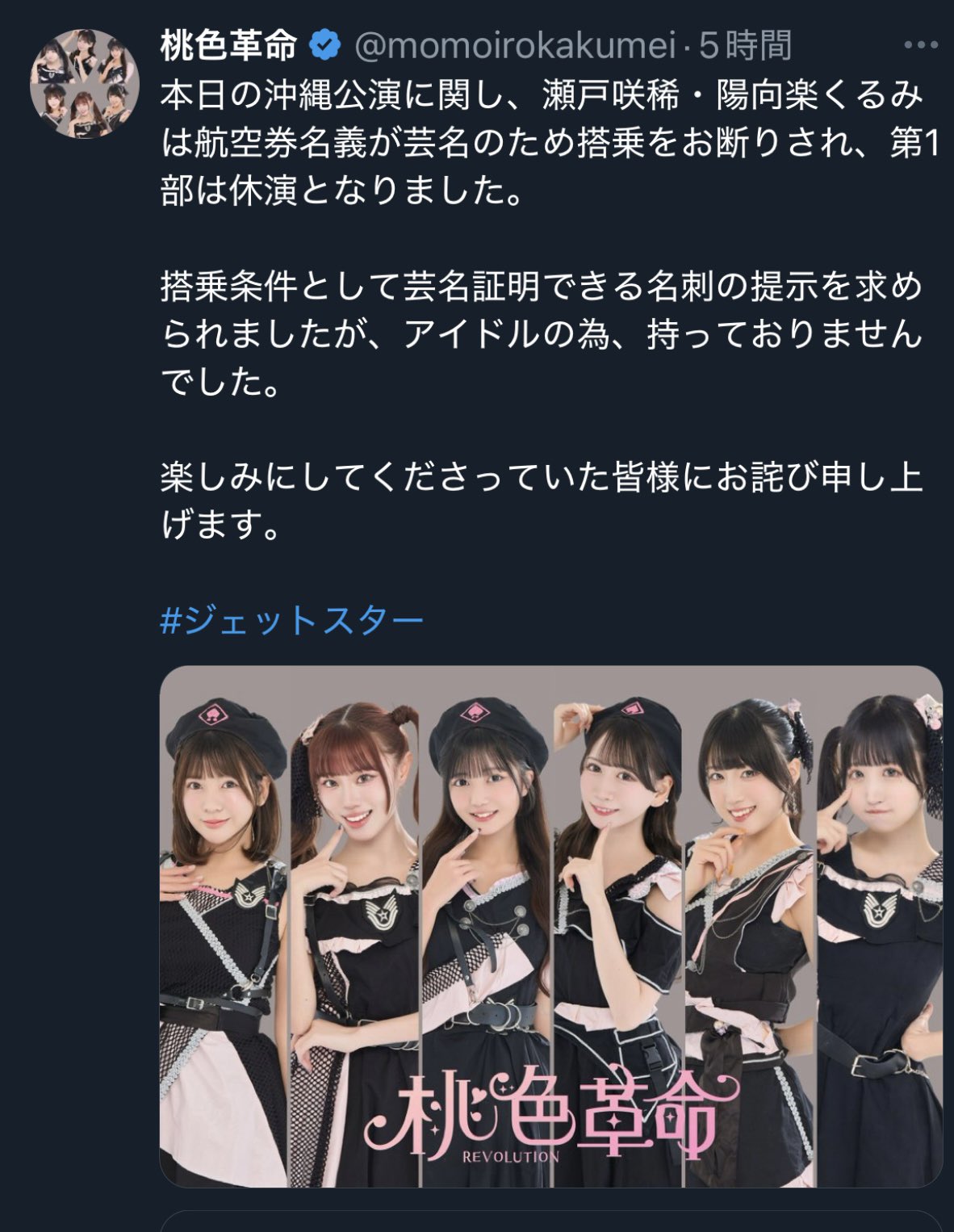 fact of life @rth429 · 3h 挙句の果てにはメンバーに謝罪させるという オマケに芸名(名前が全て平仮名)の子は搭乗出来てパフォーマンスするという謎展開付き #桃色革命 #ジェットスター すけすけ@常にマイルで旅行中 @bmwtatsu · 5h どんなアイドルグループなのか知らないけど、このストーリーと内容で、航空会社に謝罪をするためでもないのに、 #ジェットスター のタグ付ける精神の事務所があるらしい。 タグつけといてあげる。 #桃色革命 1 3 16 7.9K