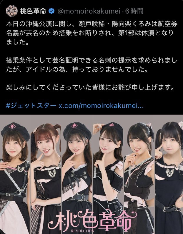 地下ドル @viv_riv6 · 1h 名刺の提示を求めた事は、せめてもの譲歩にも関わらず、桃色革命側はジェットスターに対して不信感を煽る投稿をしたが… 地下アイドルを運営する人間の稚拙さを世間に晒す結果になった。 #ジェットスター #桃色革命 航空ジャーナリストも航空会社側の対応の正当性を語ってる。 zakzak.co.jp/article/202603… 2 1.1K