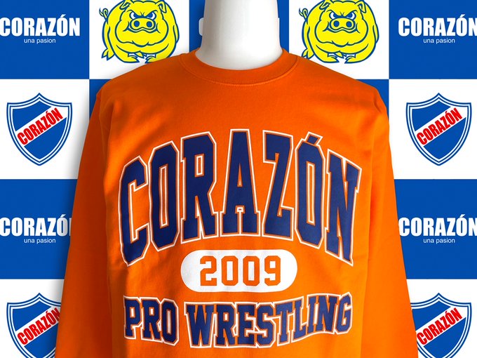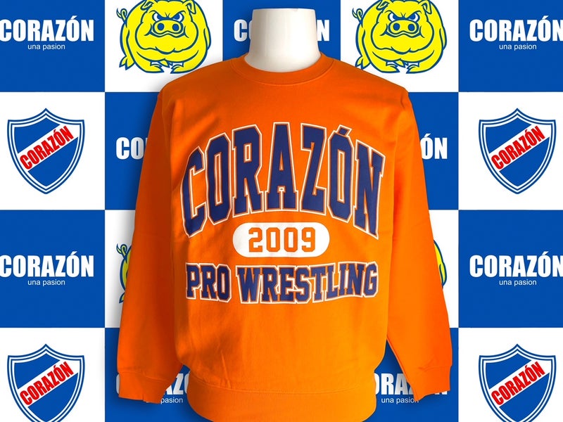 【#CORAZON】XXL完売、XLがラスト1です「CORAZON PRO WRESTLINGスウェット オレンジ」コラソンプロレスリングのカレッジ風スウェット。裏パイルで老若男女問わず着ていただけるデザイン。サイズはS~XXLまで。6,600円(税込)#デポルテス#プロレス#PROWRESTLING