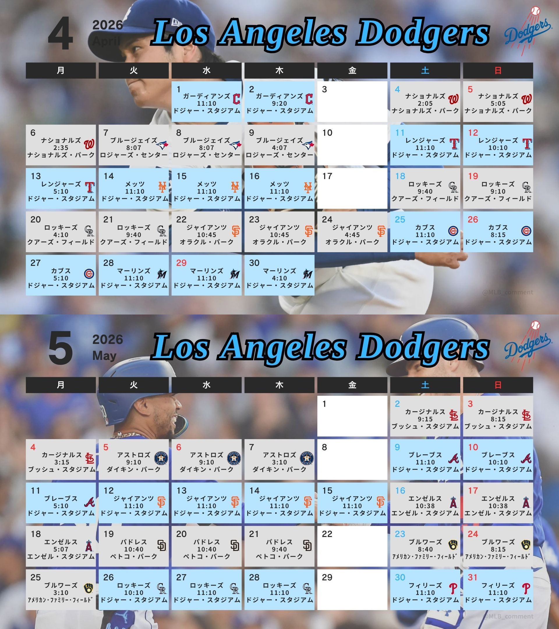 【MLB速報】放送地区【大谷速報】 @MLB_comment · 18m #ドジャース 日程カレンダー ※日本時間 【先発投手予定】 3月29日10:10 vsCLE グラスノー 3月30日ーーー 3月31日11:10 vsCLE 佐々木朗希 4月01日11:10 vsCLE 大谷翔平 4月02日09:20 vsCLE 山本由伸 4月03日ーーー 4月04日02:05 vsWSH シーハン 4月05日05:05 vsWSH グラスノー 4月06日02:35 vsWSH 大谷翔平 4月08日08:07 vsTOR 山本由伸 4月09日04:07 vsTOR ??? #大谷翔平 #山本由伸 #佐々木朗希 7 17 1.8K