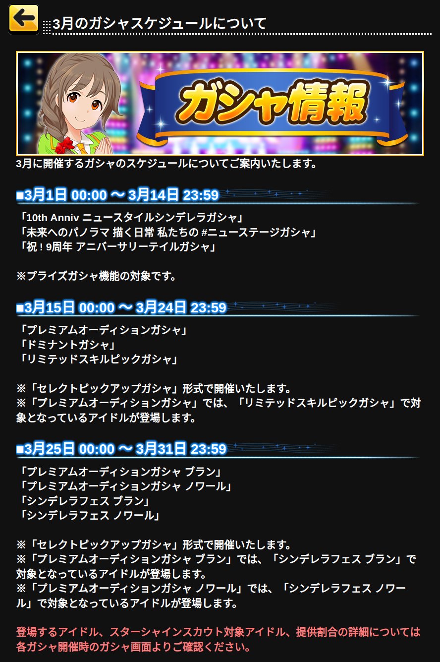 デレステお知らせbot @cgss_info · Feb 28 [iOS] [Android] 3月のガシャスケジュールについて [2026-03-01 00:05] 3月に開催するガシャのスケジュールについてご案内いたします。 ■3月1日 00:00 ~ 3月14日 23:59 「10th Anniv ニュースタイルシンデレラガシャ」 「未来へのパノラマ 描く日常 私たちの #ニュー… …rella-sl-stage.idolmaster-official.jp/news/detail?id… 2 2 397