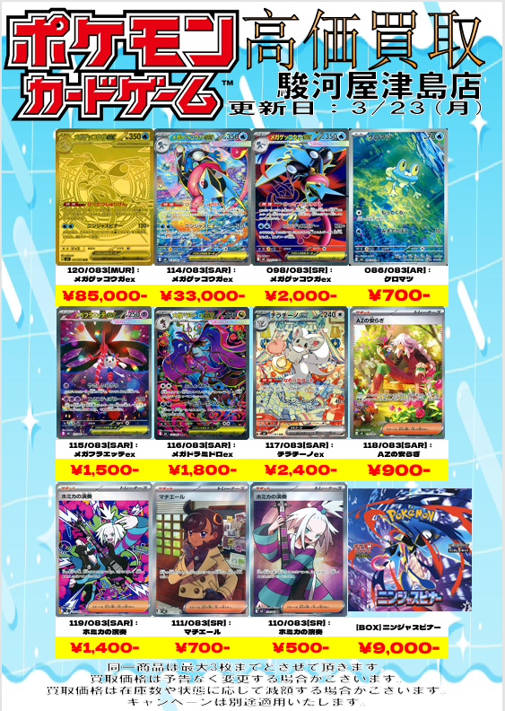 ✨駿河屋津島店✨ @surugaya_tsushi · 50m 【駿河屋津島店からのお知らせ】 #ニンジャスピナー 買取価格を更新しました!📢 話題の新弾カード、 当店ではガッツリ高価買取中です💪 ダブったカードやコレクション整理は、 ぜひ #駿河屋津島店 にお任せください!✨ 皆様のご来店 お待ちしております🙏 #駿河屋 #買取 #トレカ #メガゲッコウガq4U 130