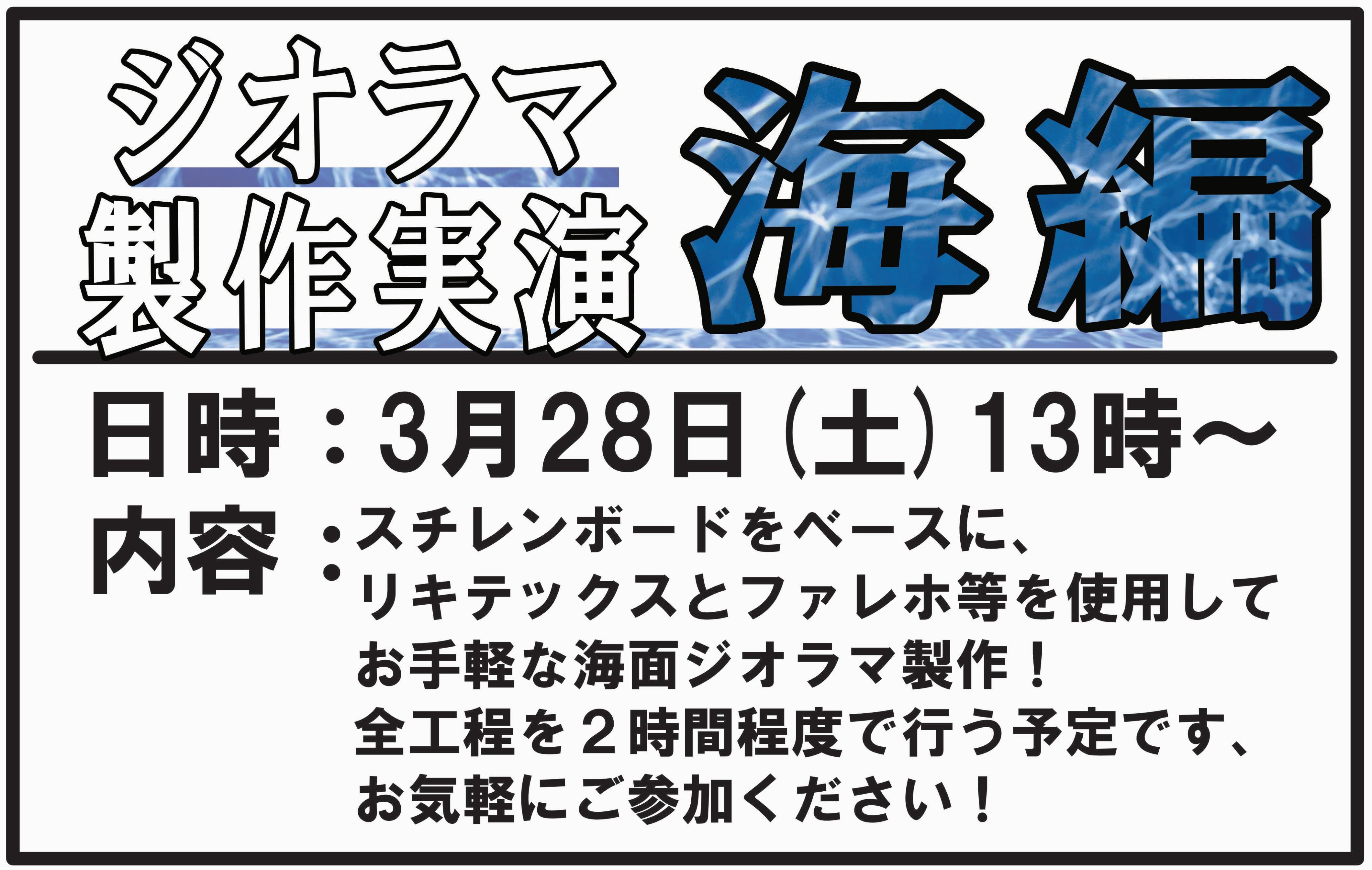 ボークス ホビースクエア秋葉原 ラジオ会館8F @vs_hsakihabara · 7h 【#俺の模型部屋 #制作実演】 本日3月28日(土)13時より開催‼️ 実演スペース【俺の模型部屋】にて、海をテーマにしたジオラマ製作実演を開催🌊 スチレンボードをベースにリキテックス ファレホ等をメインに使用していきます🎨 お気軽にご参加ください🎉 #ホビスク秋葉原 #ジオicf 2 3 472