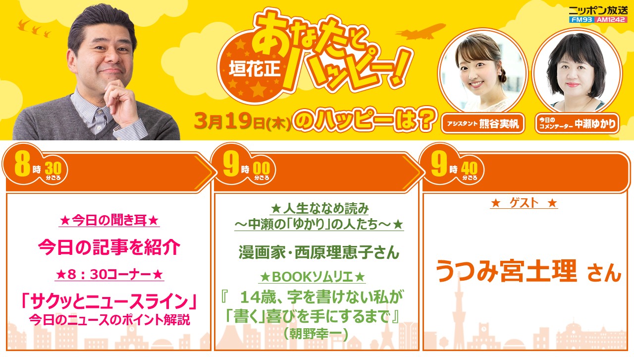 ニッポン放送「垣花正あなたとハッピー!」 @happy_1242 · Mar 18 / 【#垣花正 あなたとハッピー!】3/19(木)朝8:00☀️ 新潮社 #中瀬ゆかり さんが生出演👄 📚BOOKソムリエは、朝野幸一さん著書『14歳、字を書けない私が「書く」喜びを手にするまで』 \ ゲストは、#うつみ宮土理 さんが生出演🎙️ #垣花正ハッピー #熊谷実帆 #前島rR8 6 13 112 6.4K