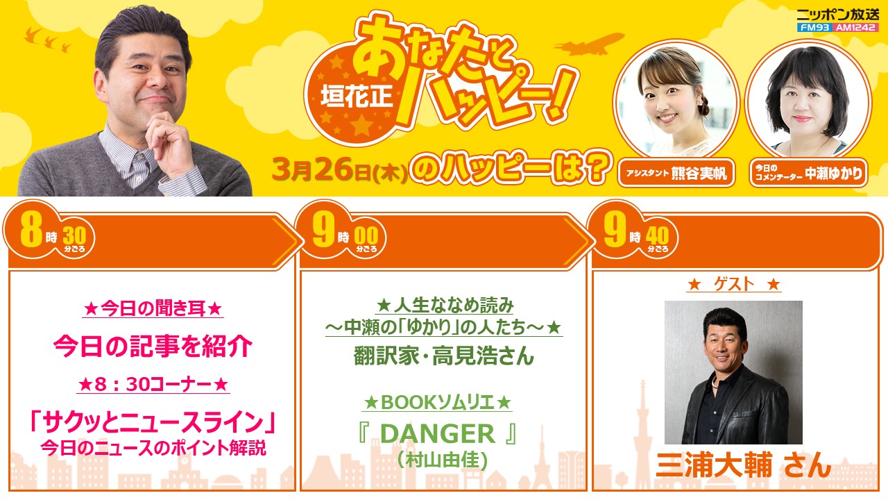 ニッポン放送「垣花正あなたとハッピー!」 @happy_1242 · 2d / 【#垣花正 あなたとハッピー!】3/26(木)朝8:00☀️ 新潮社 #中瀬ゆかり さんが生出演👄 📚BOOKソムリエは、村山由佳さん著書『DANGER』 \ ゲストは、#三浦大輔 さんが生出演🎙️ 垣花「やったー!」 #垣花正ハッピー #熊谷実帆 #前島0gM 1 14 123 7.8K