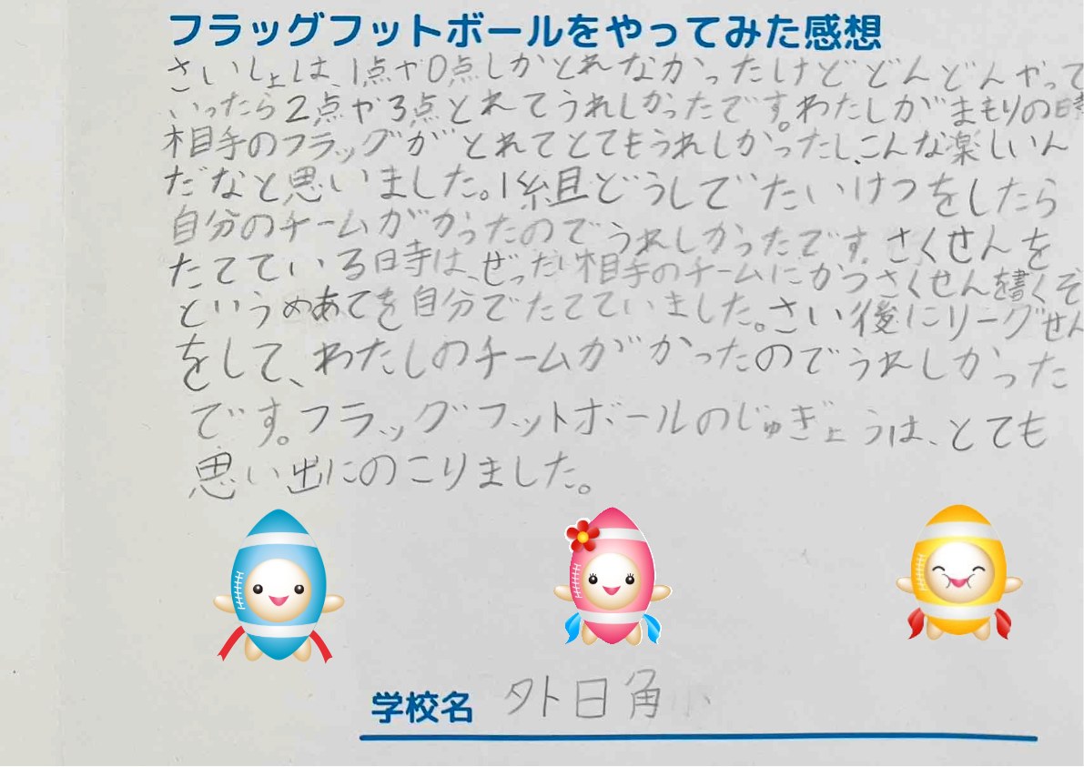 日本フラッグフットボール協会 @JFFO_official · 59m 【フラッグフットボール授業の感想】 さくせんコンクールに応募してくれた「石川県かほく市立外日角小学校」の感想を紹介します。 フラッグフットボールの授業で点が取れるようになった、勝てるようになった喜びを書いていただきました。 #フラッグフットボール #体育 #さくせんコンクール #ファミリーマート 9