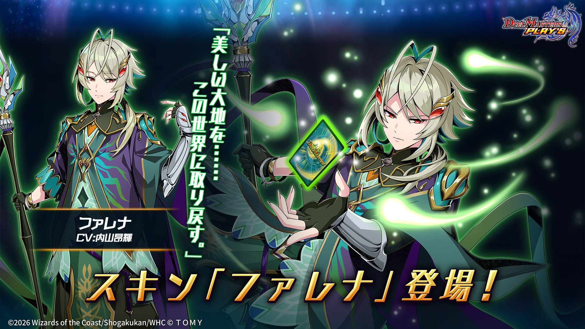 デュエル・マスターズ プレイス【公式】 @dmps_info · 1d 【新スキン紹介】 ファレナ(CV: #内山昂輝) 「美しい大地を・・・・・・この世界に取り戻す。」 #デュエプレ #無月と終葬 x.com/dmps_info/stat… デュエル・マスターズ プレイス【公式】 @dmps_info · 2d 【キャラクター&声優紹介】 ファレナ(CV: #内山昂輝) 「吠えろ、我が声と共に!!」 『無月と終葬 -GOING GREAT GALAXY!!-』は、 3月26日(木)リリース! #デュエプレ #無月と終葬 x.com/dmps_info/stat… 26 146 32.1K