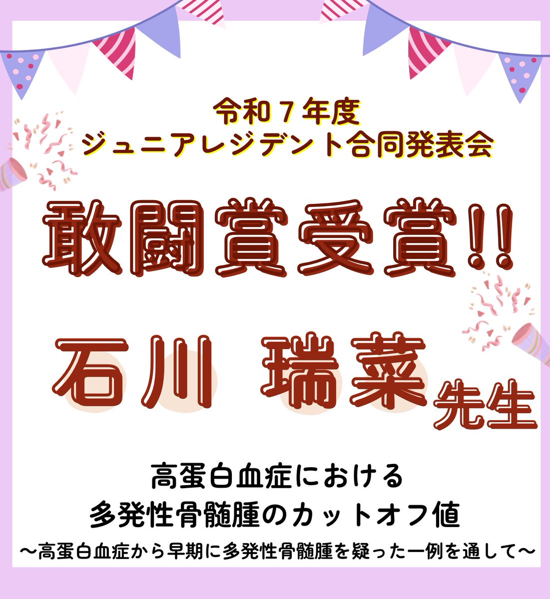 東京都立多摩北部医療センター @tamahoku_hmt · Mar 18 2月28日、全都立病院初期研修医参加により毎年開催される、研修成果の合同発表会にて、当院研修医1年目石川瑞菜先生が敢闘賞を受賞しました🏥✨ #多摩北部医療センター #たまほく #初期研修医 #ジュニアレジデント #指導のたまほくK 2 13 878