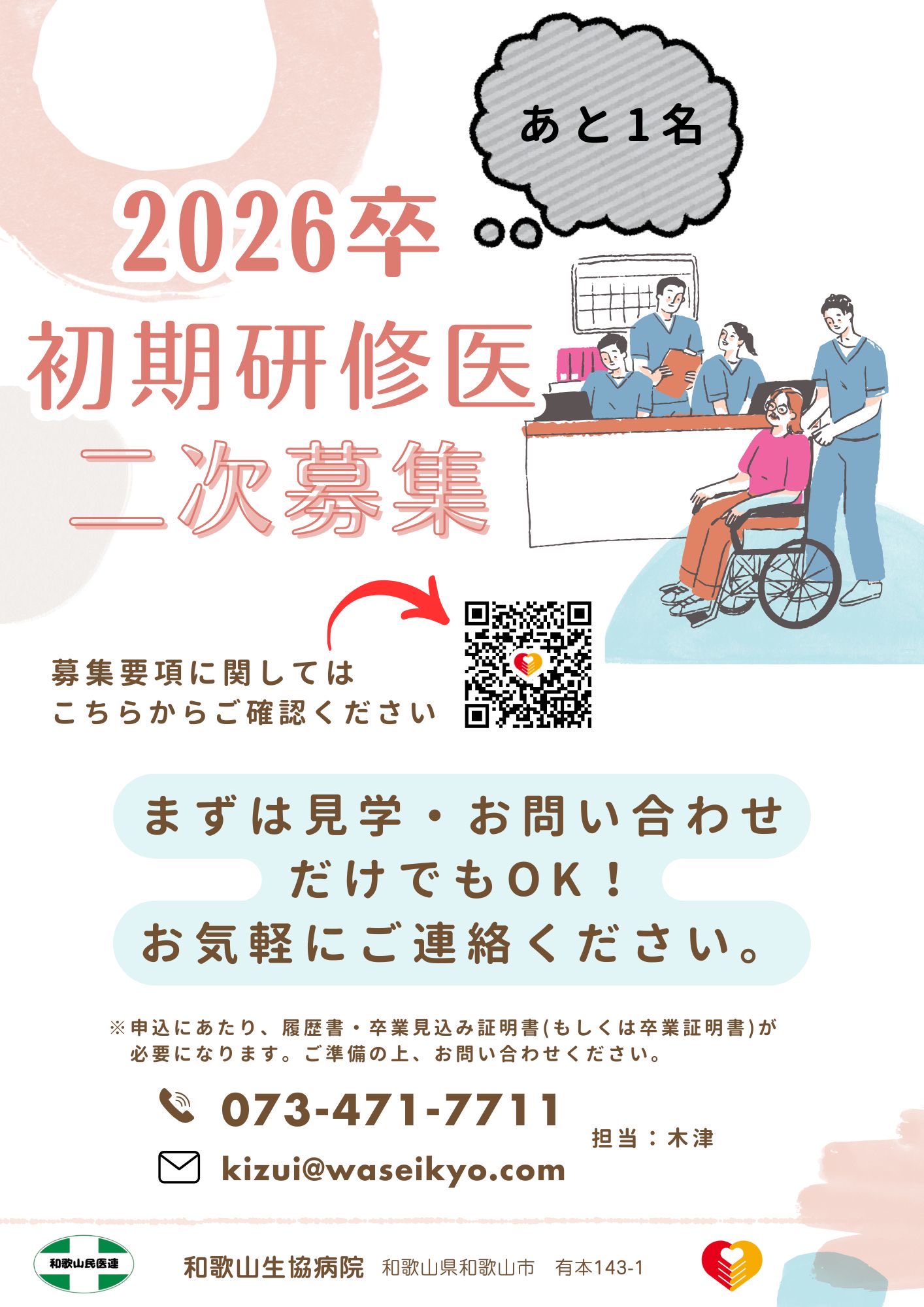 和歌山民医連医学生センター @ms_wakayama · Mar 16 2026年4月スタート 初期臨床研修医 募集のお知らせ📣 あと1名‼️ 電話又はメールにて申込を受け付けています。 まずはお気軽にご連絡ください🎵 👇募集要項は以下リンクからwakayama-coop-h.com/4453.htmlEtlm #和歌山生協病院 #和歌山民医連 #初期研修医 #研修医 #二次募集 #120回医師国YSiu 1 4 841