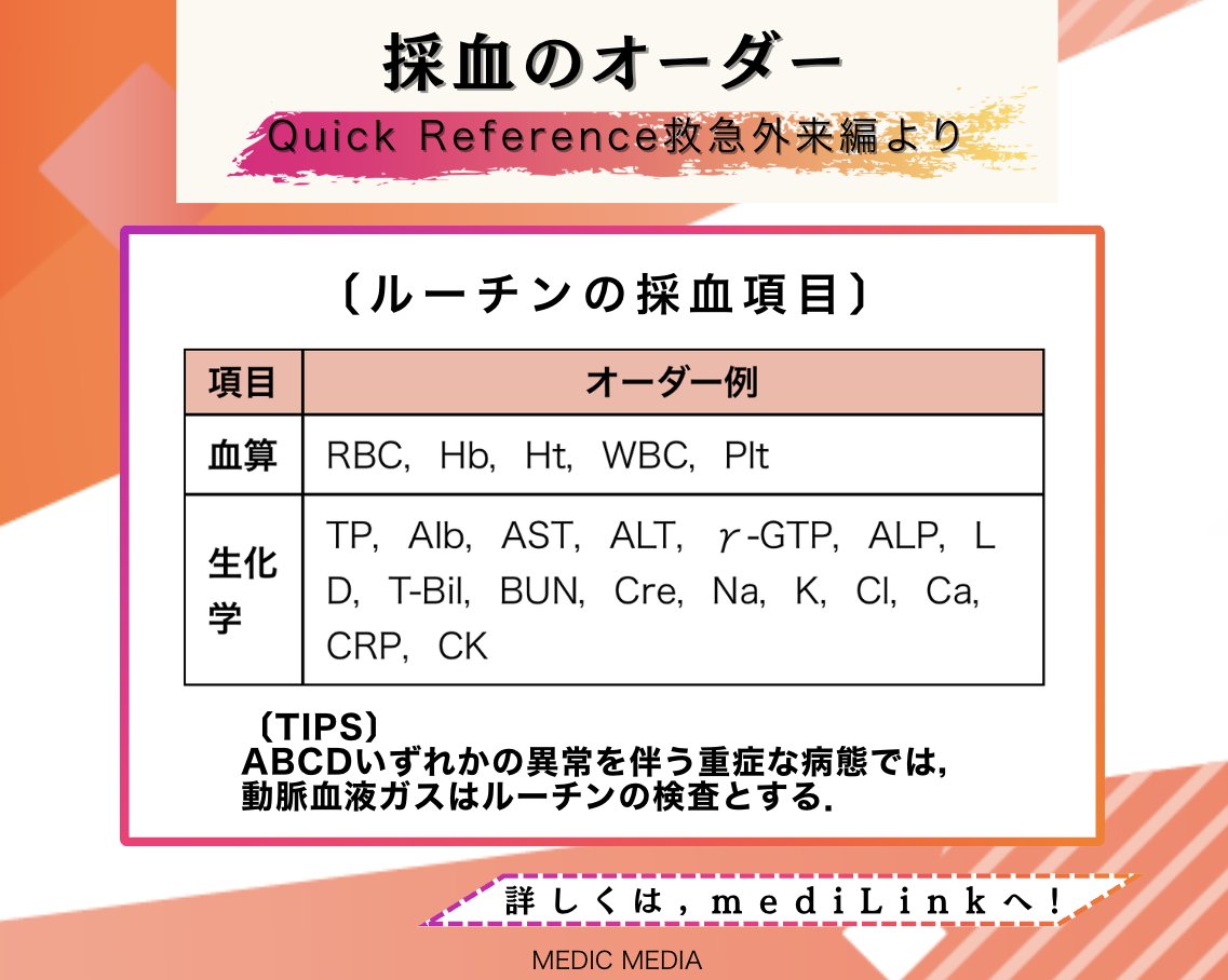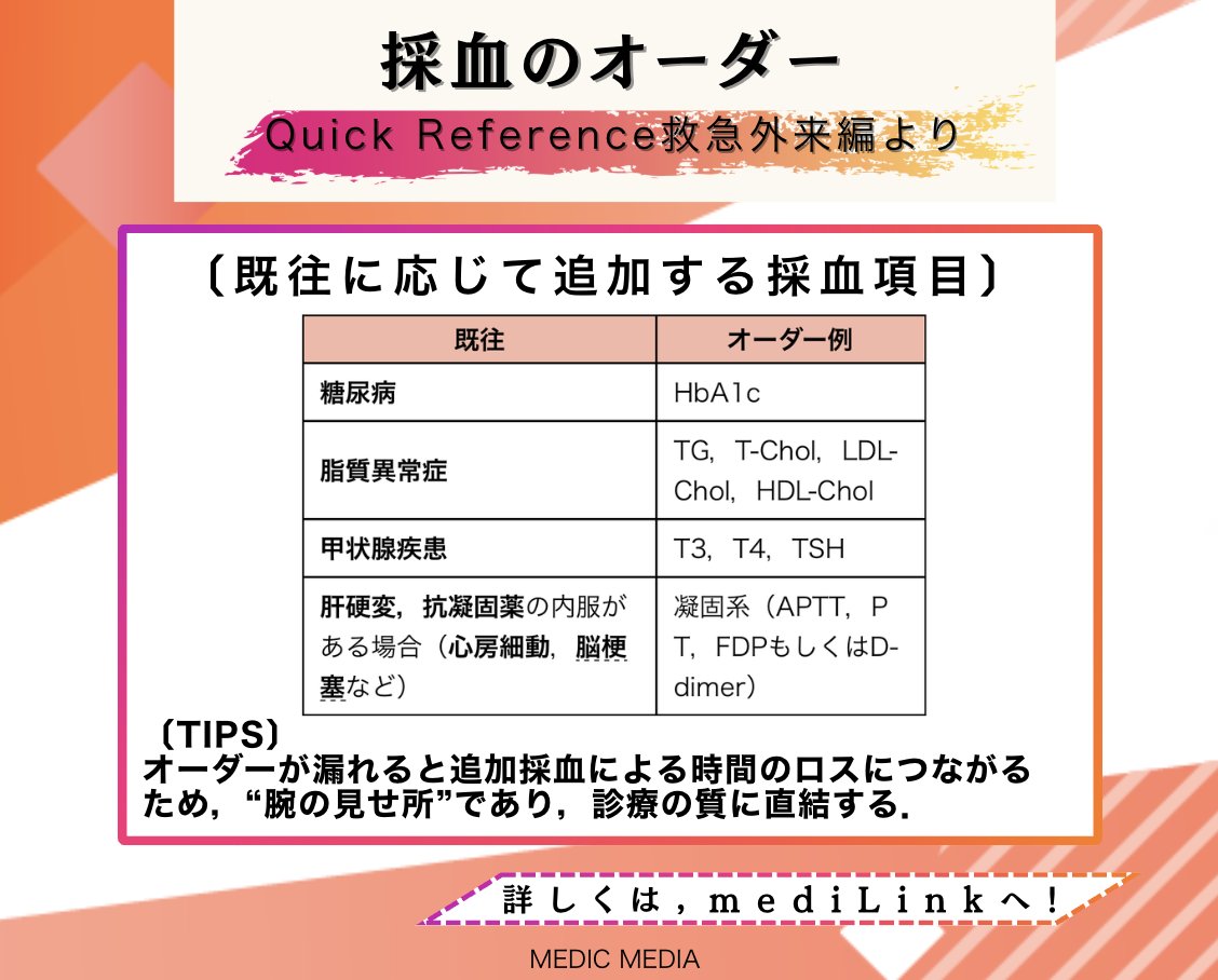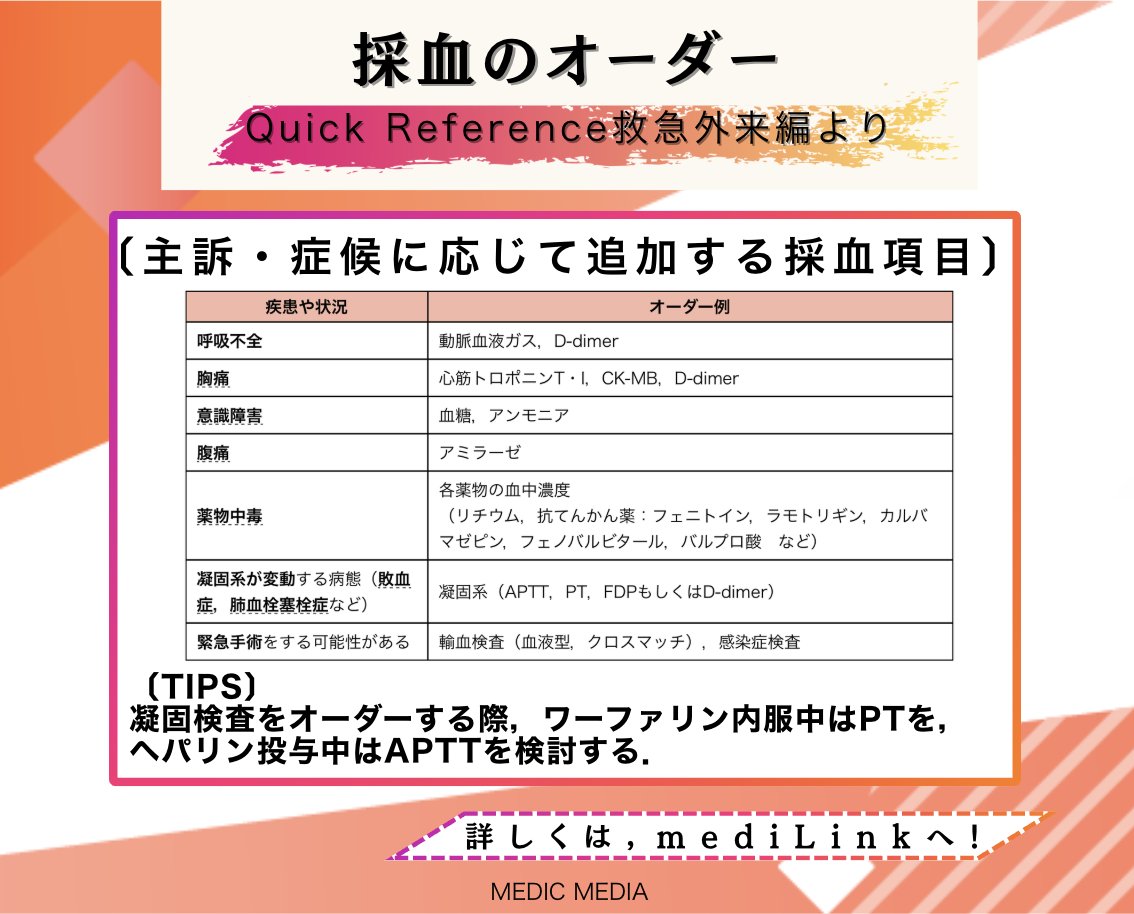 研修Assist /Q-Assist内科専門医試験|mediLink動画 @medilink_KA · 4d ◥◣研修医必見◢◤ 採血のオーダー ・ルーチンの項目 ・既往に応じて追加する項目 ・主訴・症候に応じて追加する項目 救急外来ポケットマニュアルQuick Reference 2026年4月末まで限定無料公開中. 詳細はこちら. informa.medilink-study.com/regularpost/51… #救急外来 #初期研修医 1 7 127 7.3K