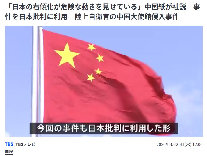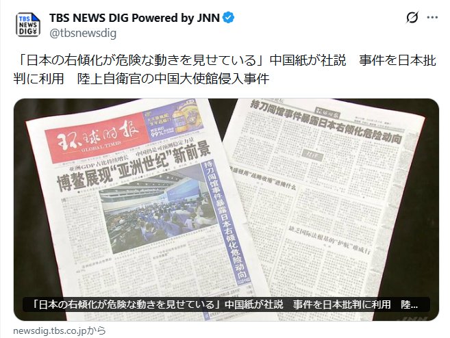 中国共産党系の国際紙「環球時報」は、「事件は日本の右傾化が危険な動きを見せている」とする社説を載せています。この中で「事件は日本国内で極右思想がまん延し、軍国主義が再び台頭しつつあるという厳しい現実…