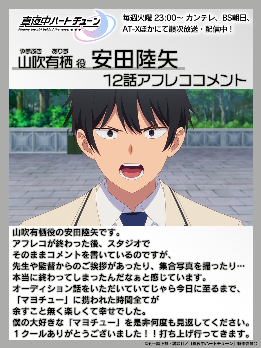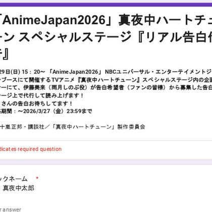 3月29日(日) 15:20~ 「AnimeJapan2026」 NBCユニバーサル・エンターテイメントジャパンブースにて開催するTVアニメ『真夜中ハートチューン』スペシャルステージ内の企画コーナーにて、伊藤美来(雨月しのぶ役)が告白希望者(ファンの皆様)から募集した告白をステージ上で代行して読み上げます! たくさんの告白お待ちしてます! 募集期間:~2026/3/27(金)23:59まで...