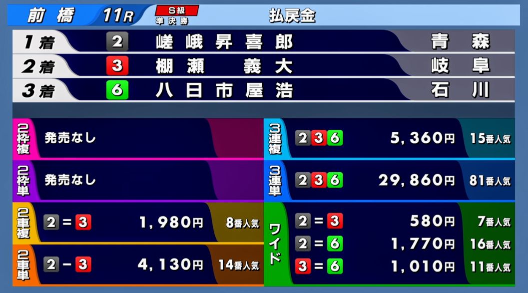 【嵯峨 昇喜郎(1着)】 「気持ち良く流れていましたね。(内藤にフタをされて)あの時点で、内藤さんが先行態勢に入るんだろうなと。流している感じもなかったので、構えてしまった。脚はたまっていたので流れてくれた。出切ってからは(1着は)決まったなと思ったけど、山崎さんが後ろに見えず申し訳なかった。脚の感じは前回より断然いい。外を踏めているし、かなりいいと思う」 【香川 雄介(2着)】...