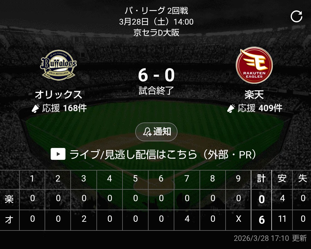 SGトシオ @toshio_009 · 1h まけほ😭 やりかえされた・・ #楽天イーグルス パ・リーグ.com / パーソル パ・リーグTV【公式】 @PacificleagueTV · 1h / パーソル パ・リーグ 順位表 (3/28) \ ⚾️ロ 11-0 西 ⚾️オ 6-0 楽 ⚾️ソ 6-4 日 #lovefighters #RakutenEagles #seibulions #chibalotte #Bs2026 #sbhawks 1 99